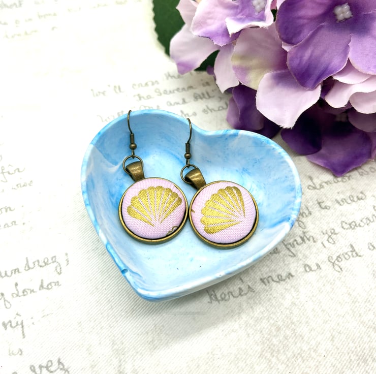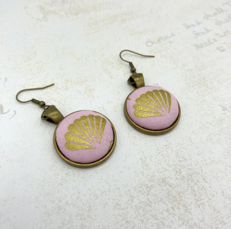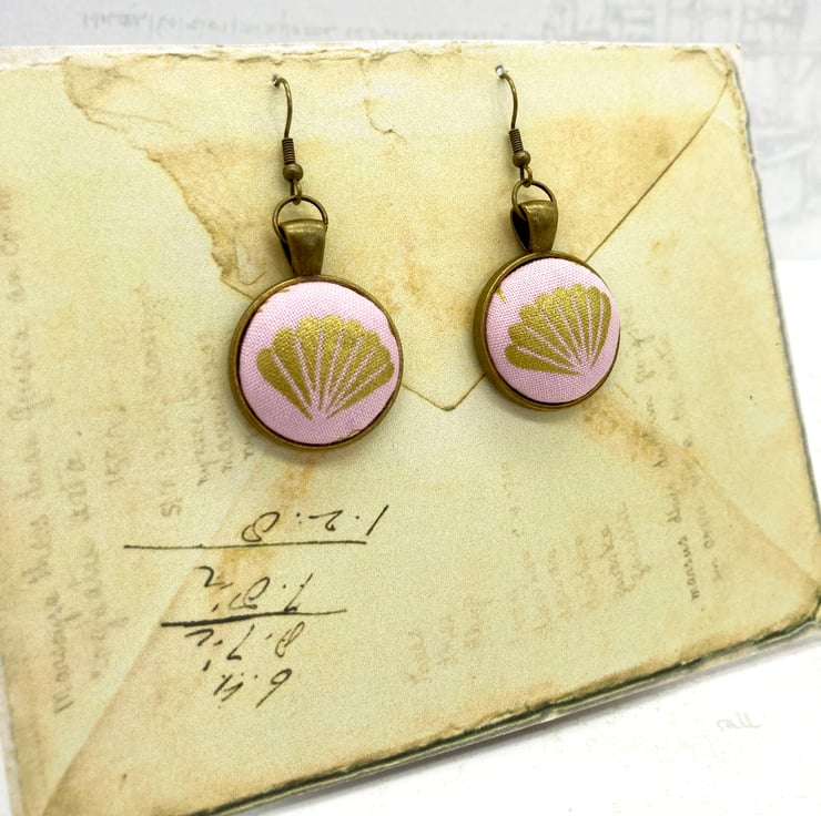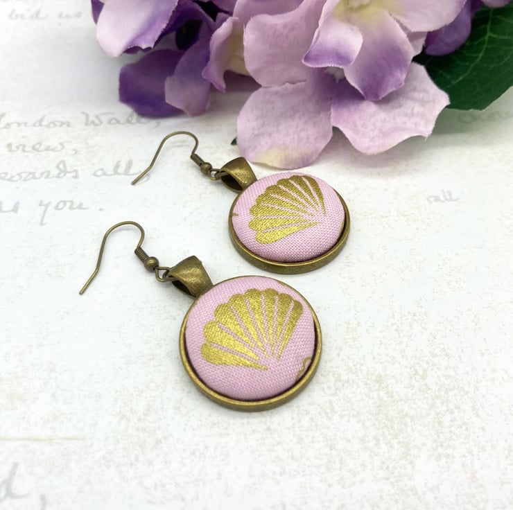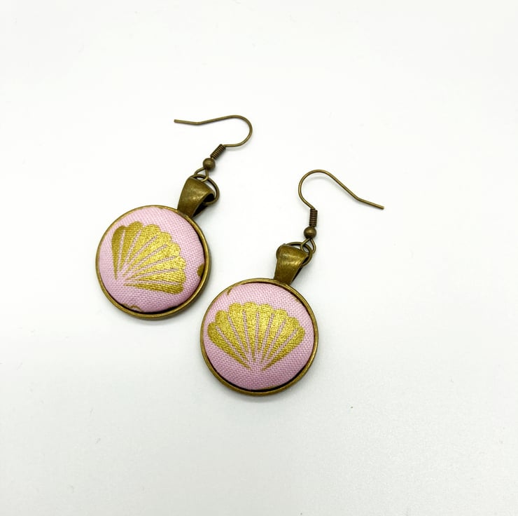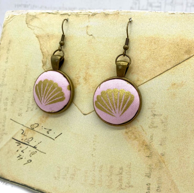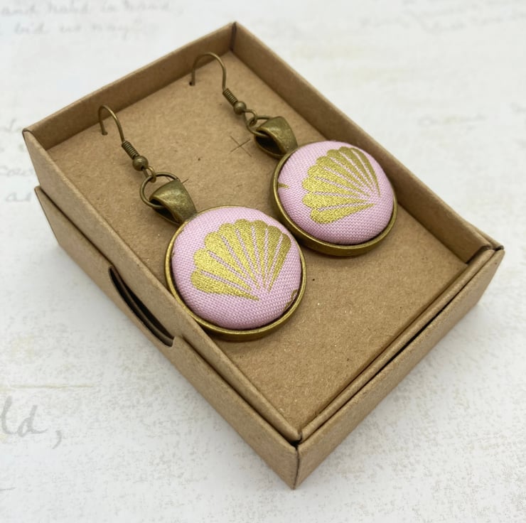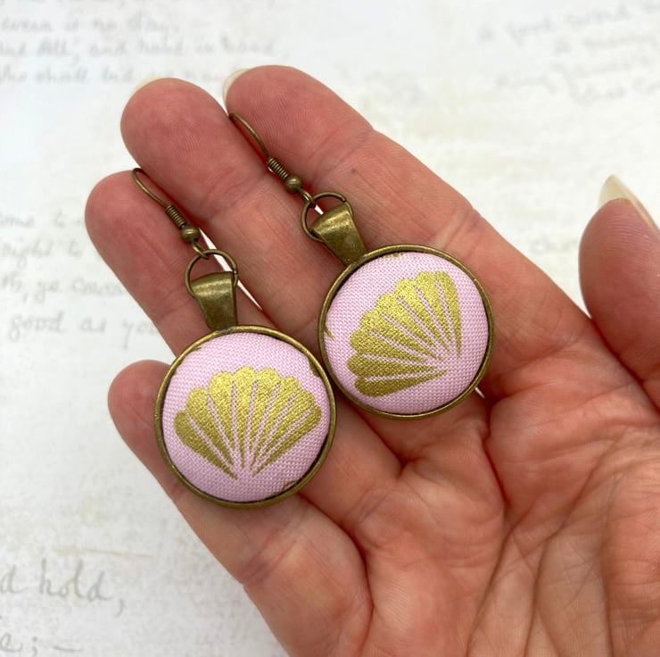 A pair of golden scallop shells, shimmering in the light over a pale pink background, as you go about your day – these unique earrings are perfect for the shell seeker or beach comber and are created from fabric covered buttons!