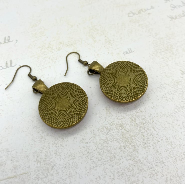 I have set the buttons within these cute antique bronze plated settings that feature a lovely geometric pattern on the back. I’ve then teamed these earrings with matching antique bronze plated earring hooks and so the total drop length is about 5.5cm and the diameter of the earring in the setting is about 2.6 cm.