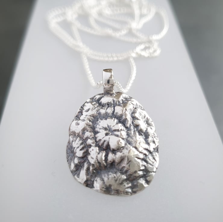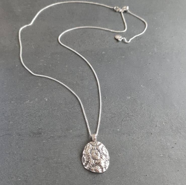 Here the pendant measures 3cm x 2.5cm and has a lovely weight and thickness to it. The back of the pendant is smooth. The 1.2mm round box chain is of great quality and has a slider bead allowing for the length to be adjusted between 36cm (14in) and 57cm (22in).