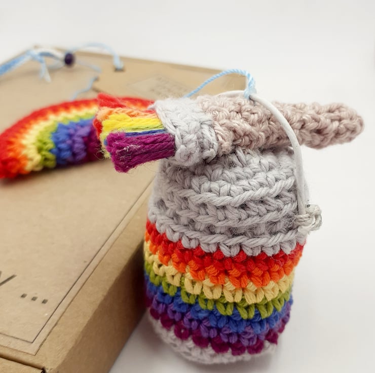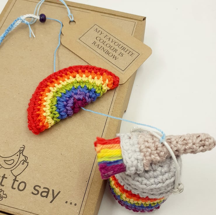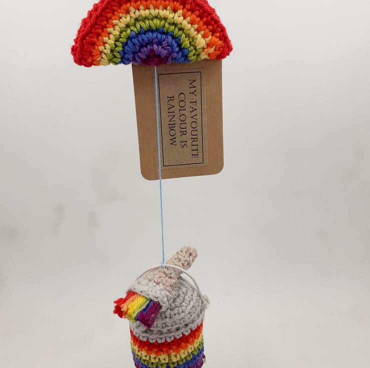 This cheerful mini hanger would make a novel, keepsake alternative to a greetings card. The rainbow, pot and brush are crocheted in cotton. The rainbow is lined with craft felt and the pot filled with polyester stuffing. The bristles of the brush are stiffened with PVA and the top and base of the pot have a coin in them to help maintain the shape and to add useful weight to the hanger. The paint pot has a wire handle. The tag reads 'My favourite colour is rainbow!' although I am very happy to exchange this tag for one with wording of your choice. The whole decoration measures approximately 30 cm in length. It comes in shredded tissue in a labelled PIP ( Postage in Proportion) box all ready to be given or posted on if required. This item is designed to be posted as a large letter rather than as a parcel, the pot will just need a little reshaping on arrival.