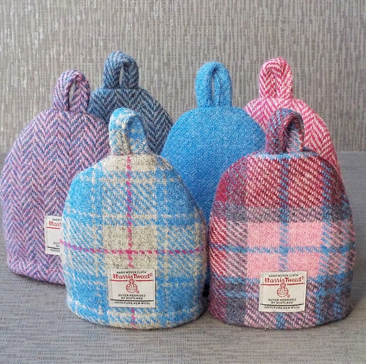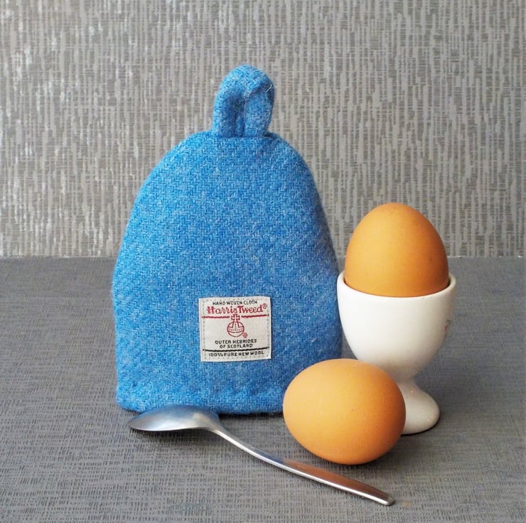 What a charming cosy! This bright blue egg cosy has been handmade from Harris tweed. I've been making tea cosies for many years. Now I've created a scaled-down version to fit your breakfast egg. A lovely addition to your table and a perfect little gift.