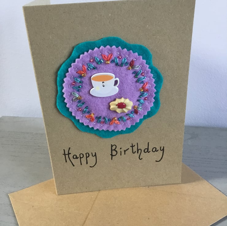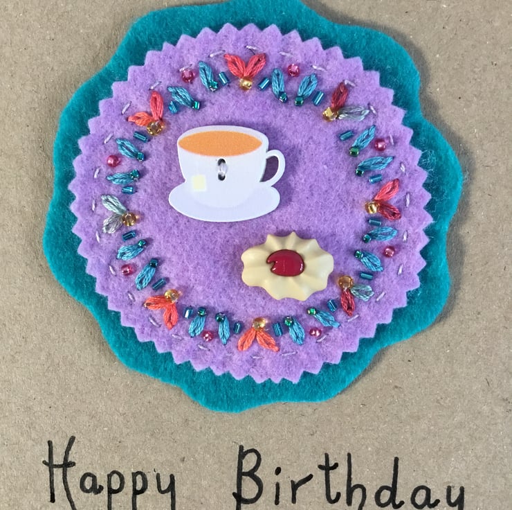 This Hand Embroidered Friendship Birthday Card is ideal for a friend who likes chats over a cup of tea and a biscuit......it’s ready to send friendly birthday wishes.....