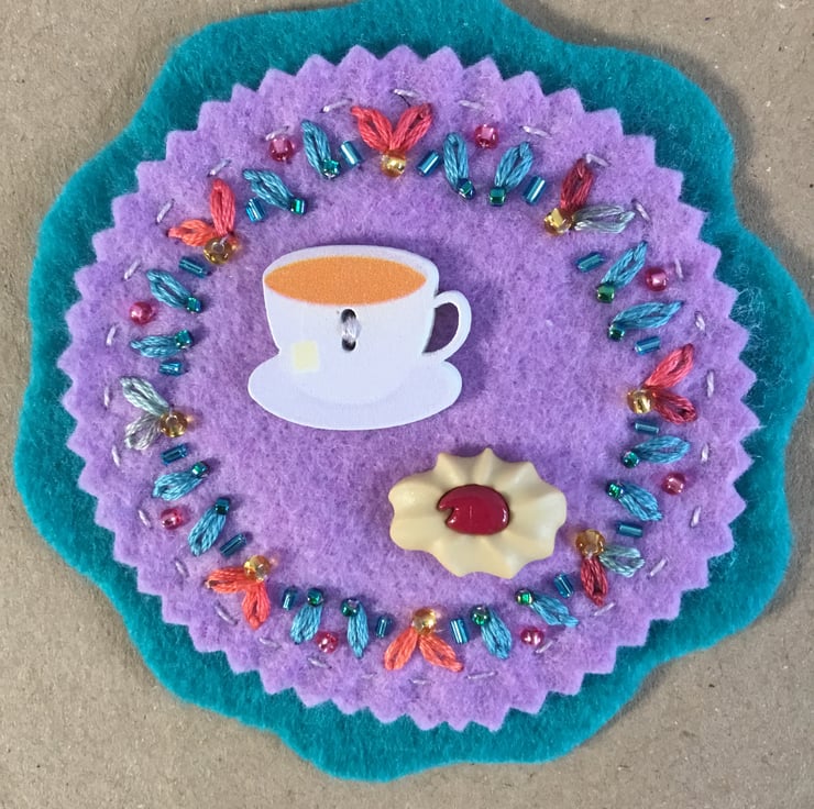 This Hand Embroidered Friendship Birthday Card has a friendship scene.... a Tea cup and a Biscuit button are stitched onto circles of lilac and turquoise blue felt. Hand embroidered Lazy-Daisy Stitches in red, coral pink and blue embroidery threads with golden, pink and blue beads, surround this Tea Time scene of friendship .......having a nice cup of tea and chat with a friend.....