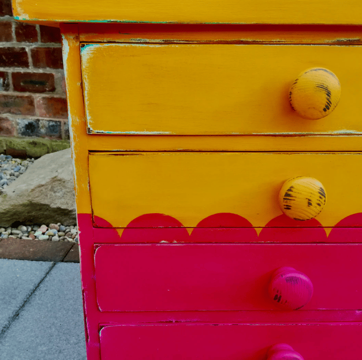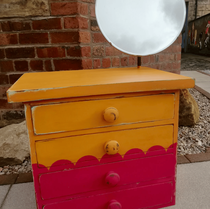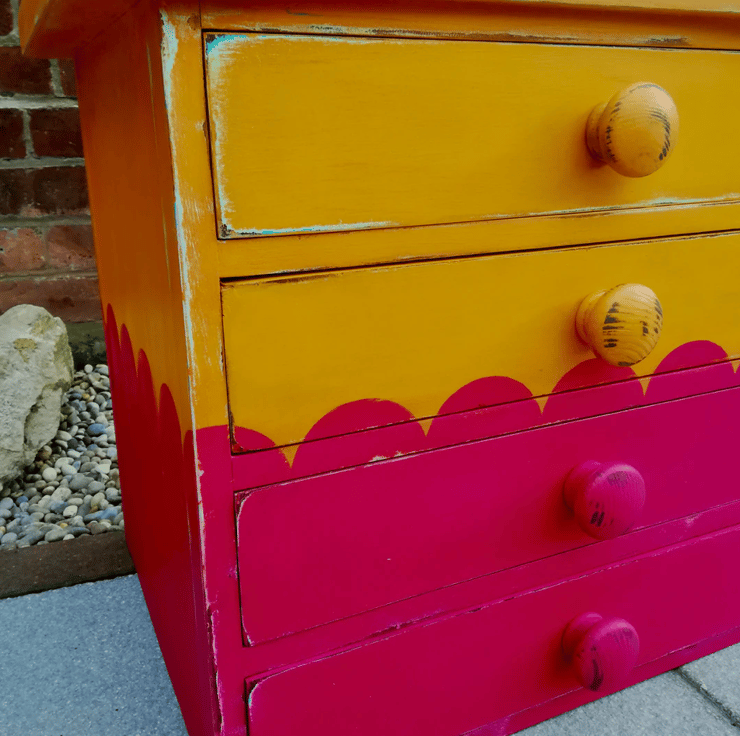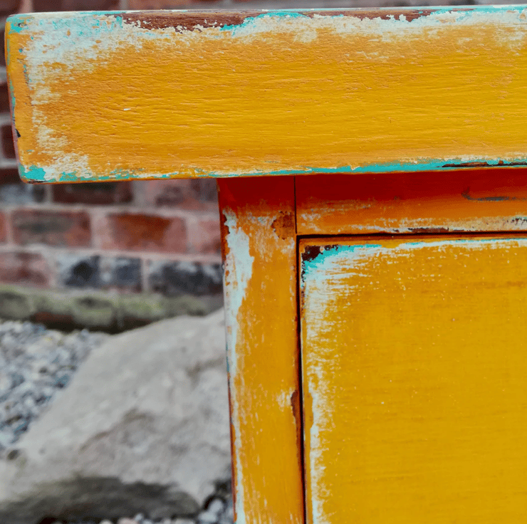 This little Boho beauty is painted in Annie Sloan chalk paint and heavily distressed to reveal the layers of colour. Painted in blue orange and bright pink. 65cm wide x 51cm deep X 57cm high.