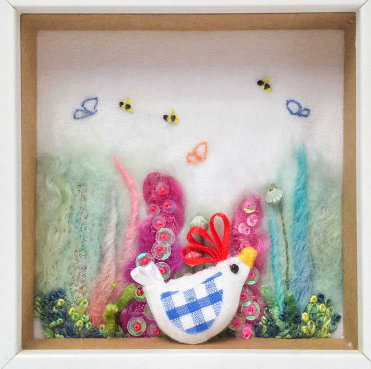 Unique tiny chick design incorporating needle felting, freemotion and hand embroidery. A tiny linen chick with appliqué fabric wing enjoys a stroll through their own cottage garden. Sequinned foxgloves and delphiniums all evoke a feeling of high summer. Kept company by french knot bees and butterflies.