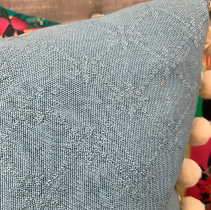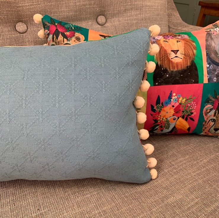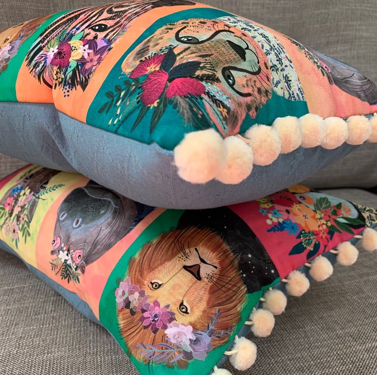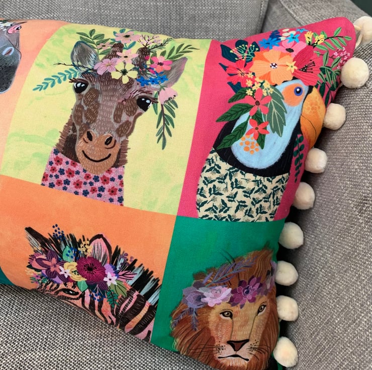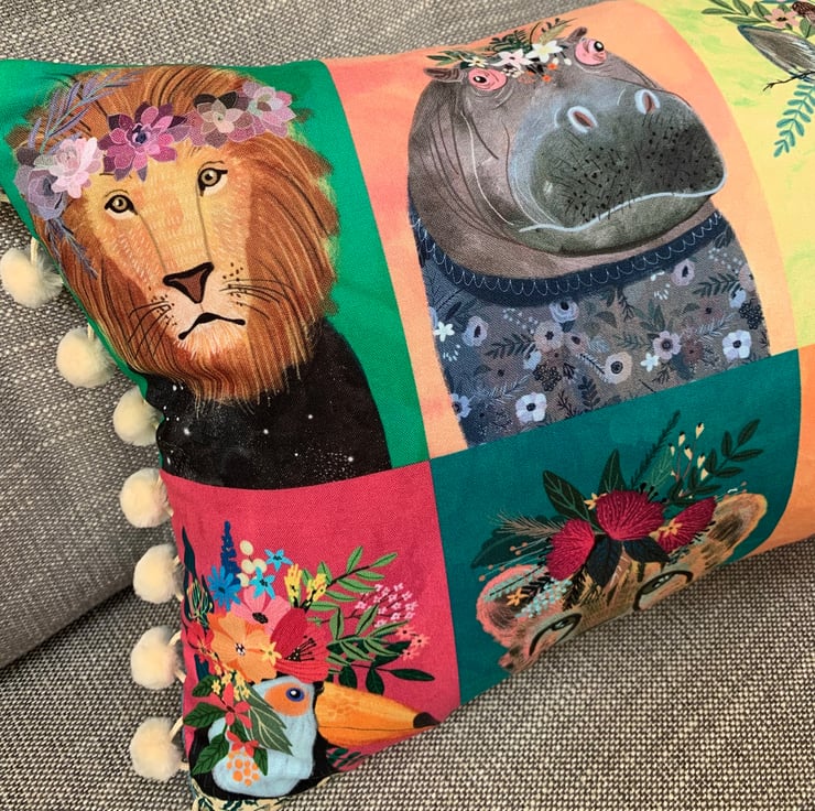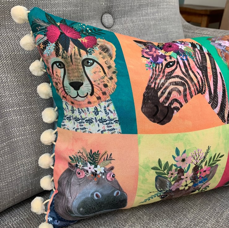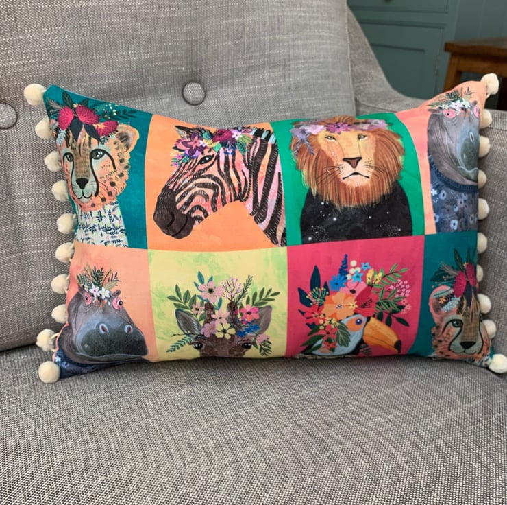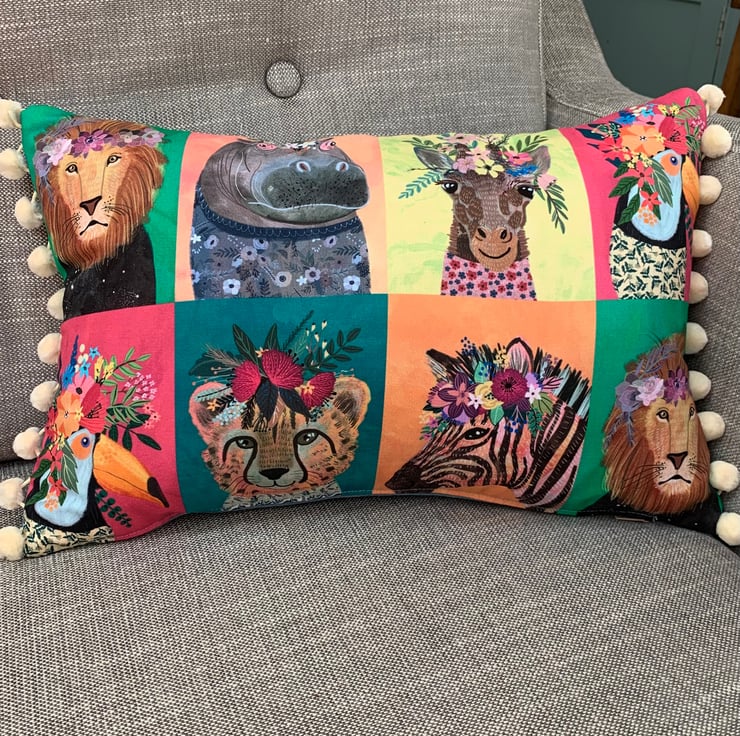 Pretty and fun animal print cotton cushion cover. It features a zebra, hippo, cheetah, toucan and giraffe in bright colours with lots of flowers. It is backed with textured blue cotton and trimmed with velvety cream pompoms. The cover is designed to fit a 12x18” filler (30x45cm)