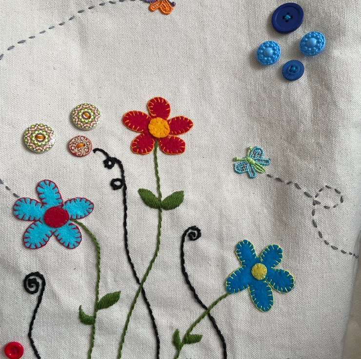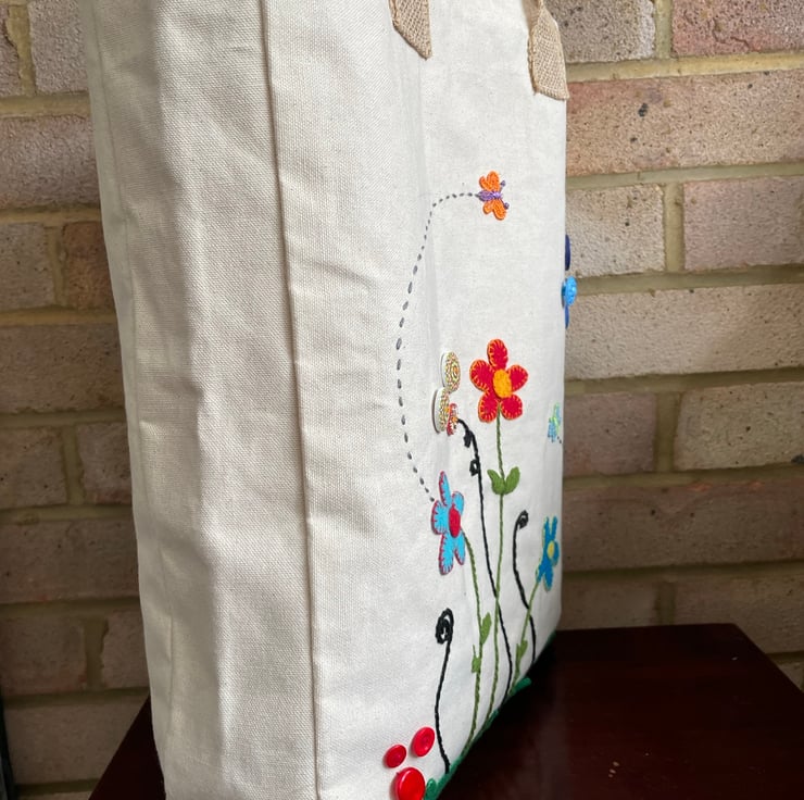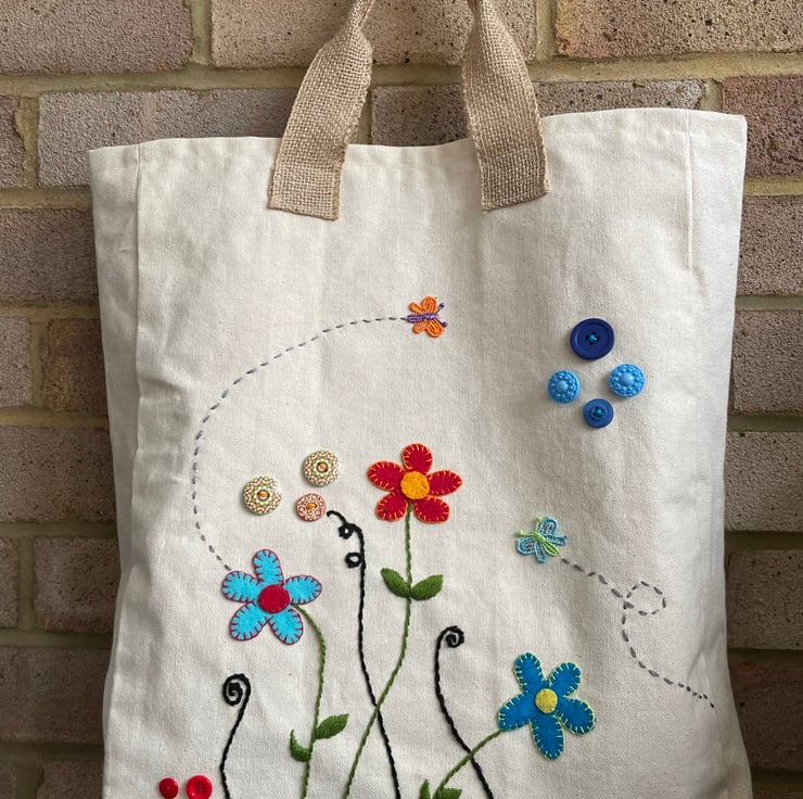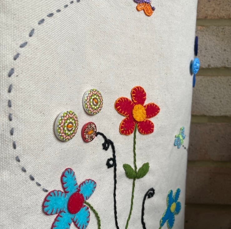 Made from cream canvas with a fun image of flowers, adorned with butterflies and buttons. A reusable and sustainable gift for someone or as a treat for yourself!
