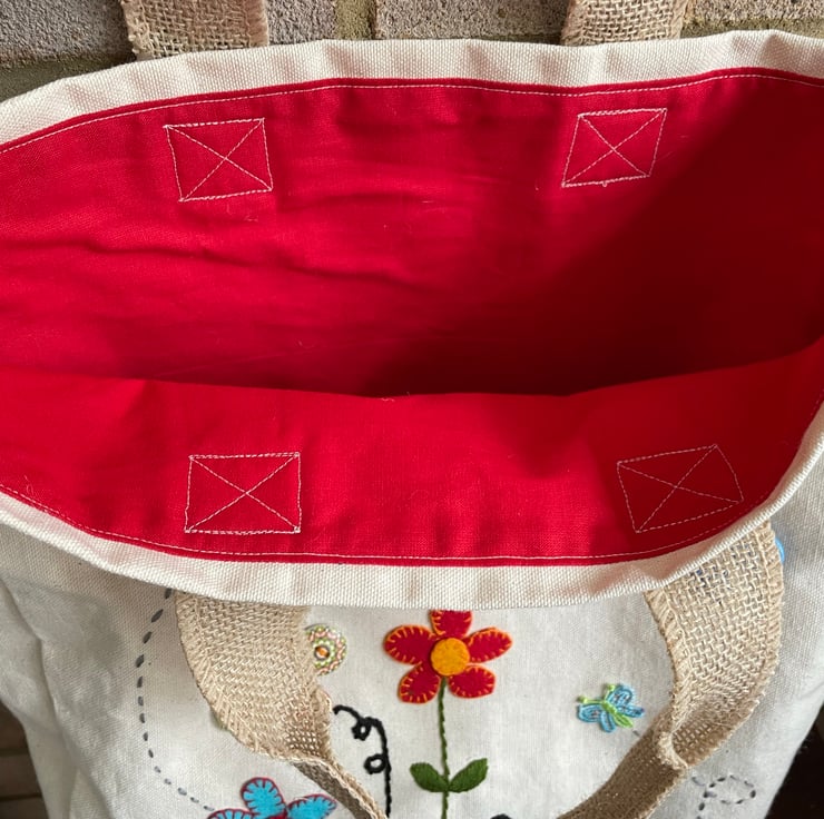 Lined with eye catching red cotton with open weave natural coloured handles. The bottom seam is top stitched to give the bag extra strength.