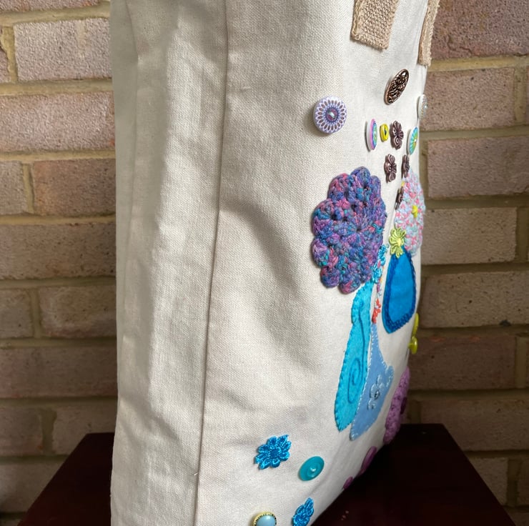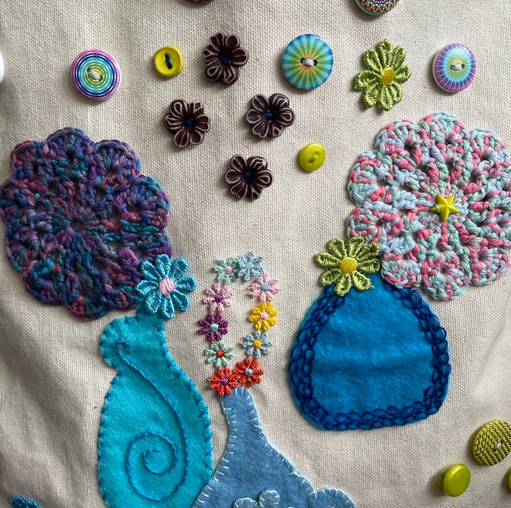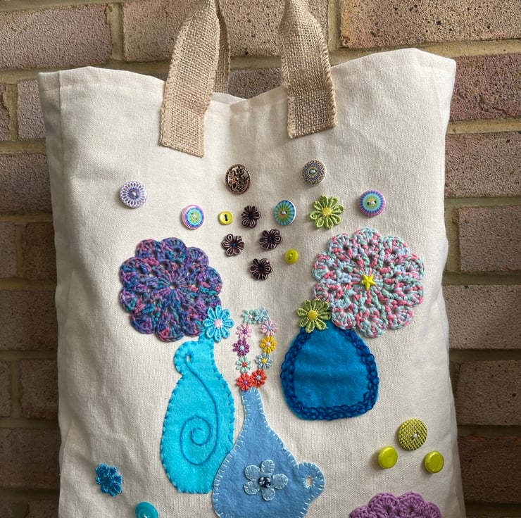 Made from cream canvas with felt vases, crotcheted flowers and buttons hand sewn on the front. A reusable and sustainable gift for someone or a treat for yourself!