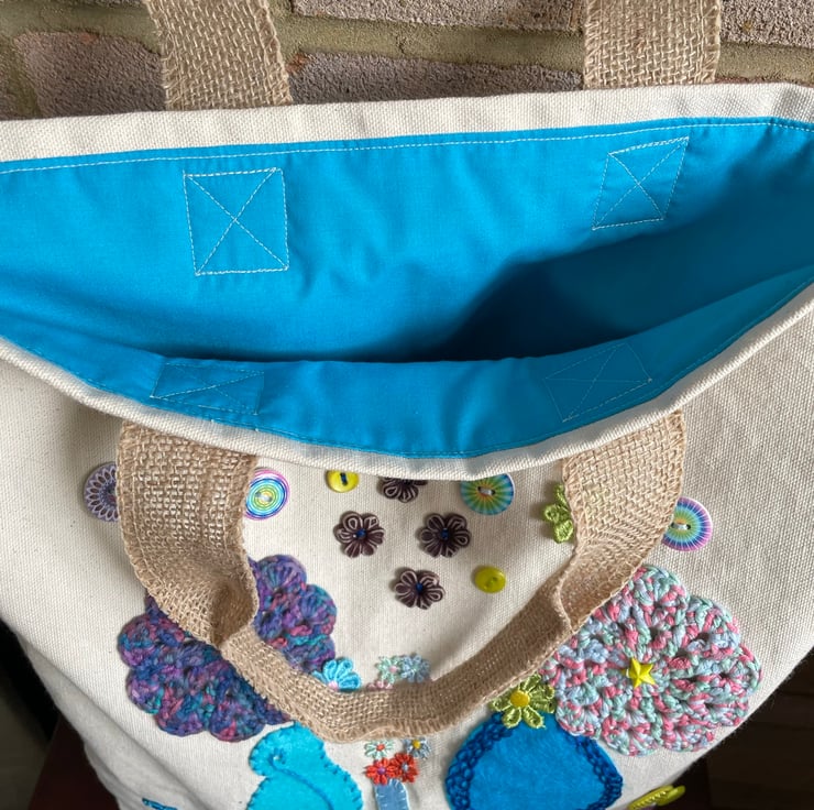 Lined with eye catching turquoise cotton with open weave natural coloured handles. The bottom seam is top stitched to give the bag extra strength.