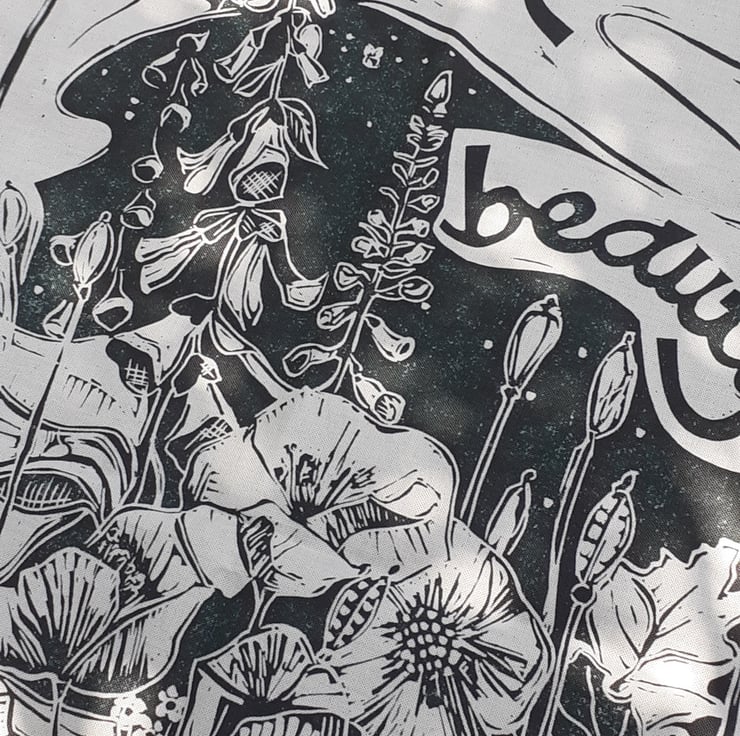 This ‘Wild Beauty’ tea towel features an enlarged reproduction of my original linocut, digitally printed in dark green ink onto a lovely natural, unbleached 100% cotton fabric.