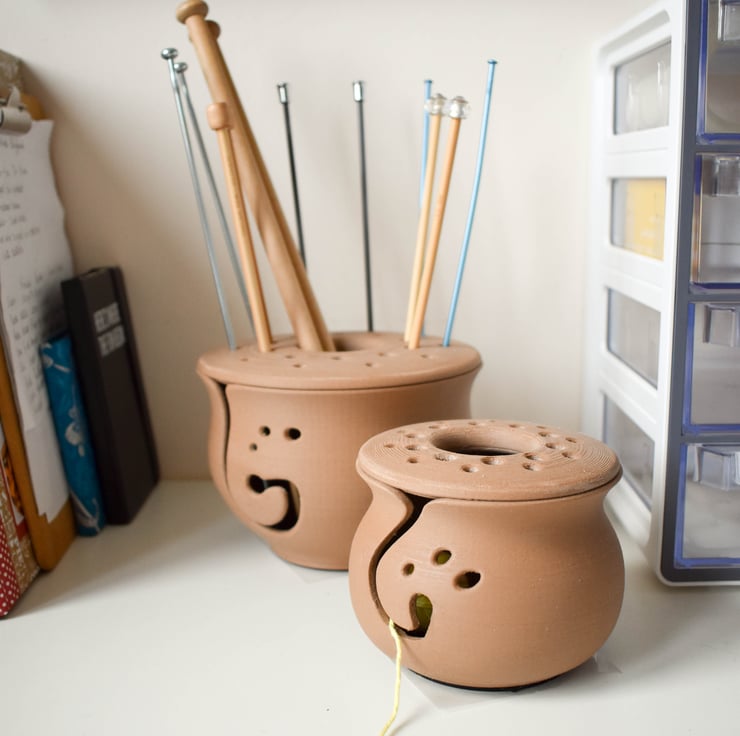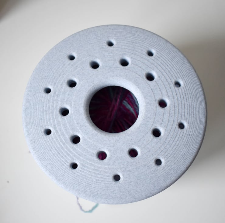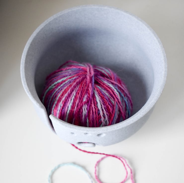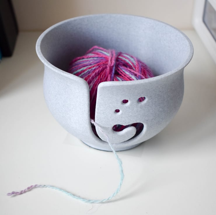 This yarn bowl has been 3D printed using PLA filament (Polylactic acid is a thermoplastic aliphatic polyester derived from renewable resources, such as corn starch) to give a natural marble effect. The bowl is light grey in colour so would fit in with any living space or work room.