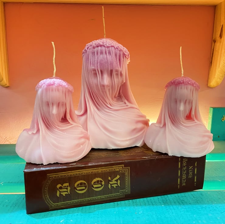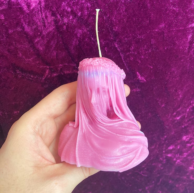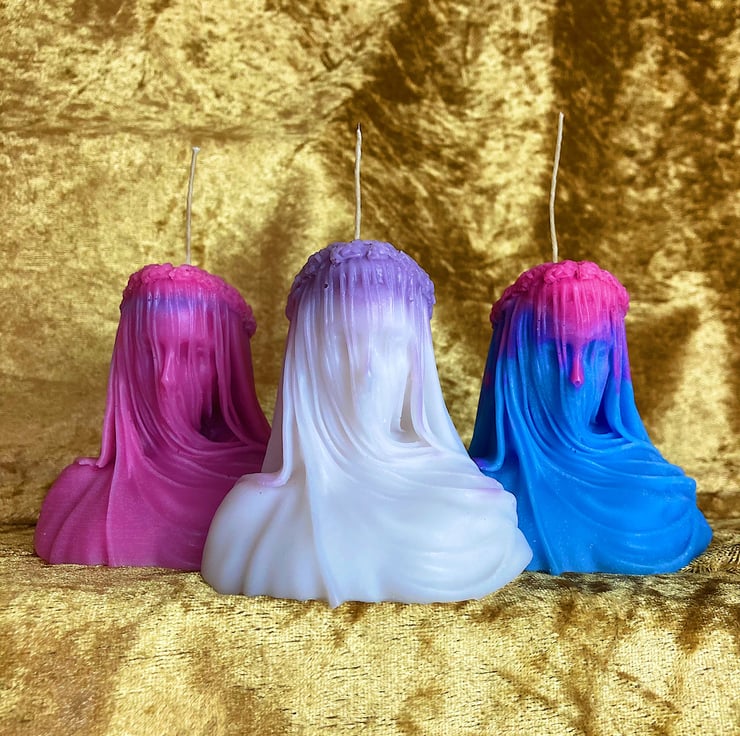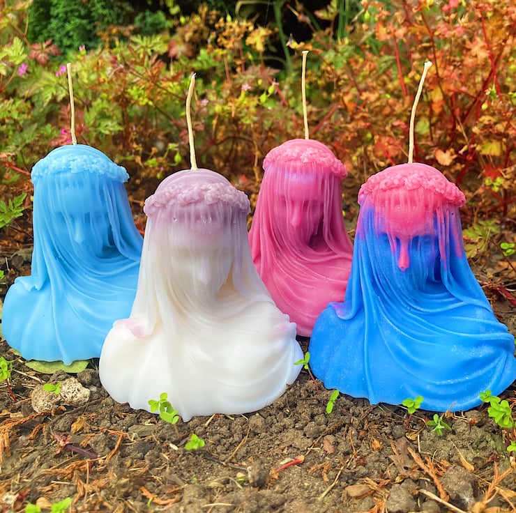 These candles are each hand poured in shades of pastel pinks, blues and white