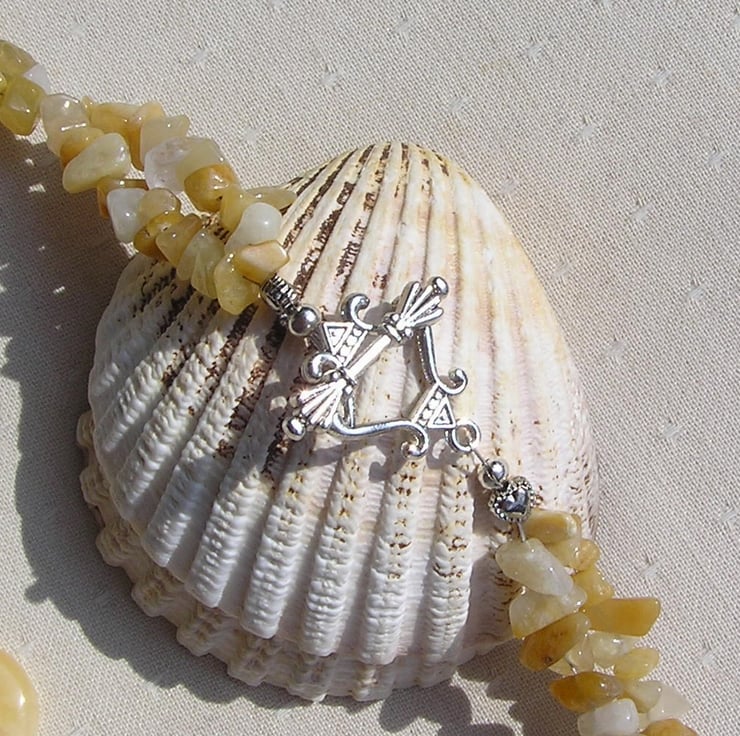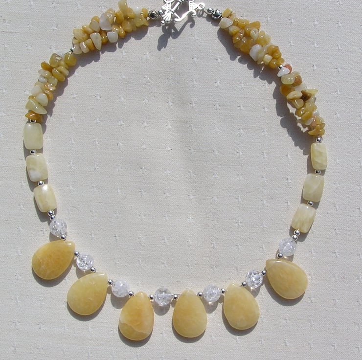 This Beautiful Necklace is made from Honey Quartz, Frosted Clear Quartz and Yellow Opal Beads. The Central swathe is made from Stunning Focal Honey Quartz Tear-drops seperated by Frosted Clear Quartz and tiny Silver spacer beads, these flow into a short section of more Honey Quartz beads, this time oblong shaped ones and finally double-stranded Yellow Opal gem chips - a Beautiful combination that will look stunning either worn casually or with something more Elegant for a Special Evening out