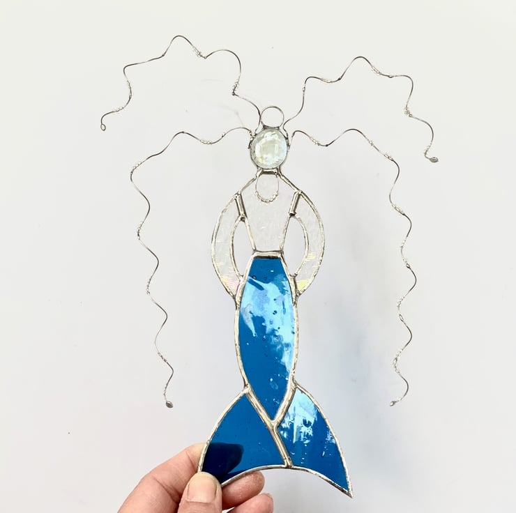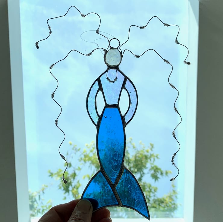 Each piece of glass has been hand cut, ground, washed, foiled, soldered together and washed again. Twisted tinned wire with clear beads has been used for the hair and necklace.
