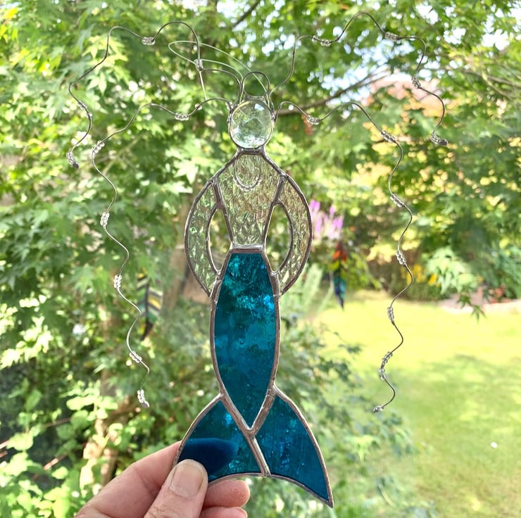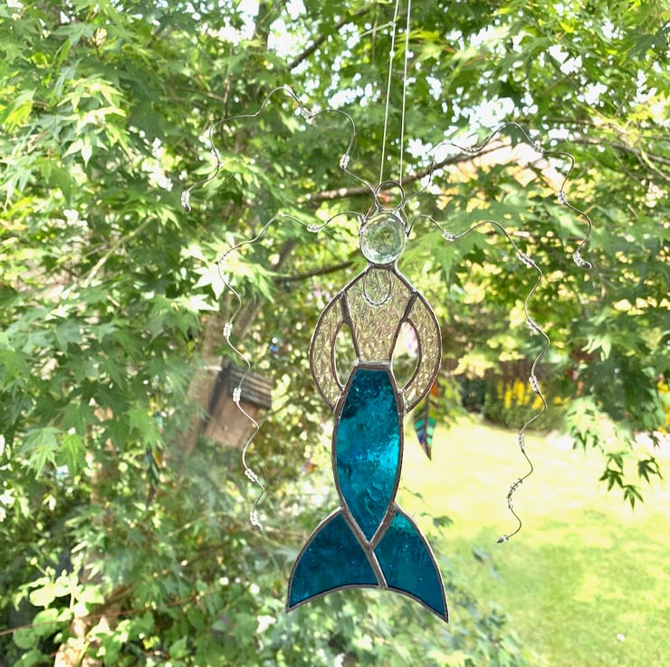 The glass used in turquoise sea glass for the tail and irredised granite backed glass for the body, a clear glass nugget has been used for the head.