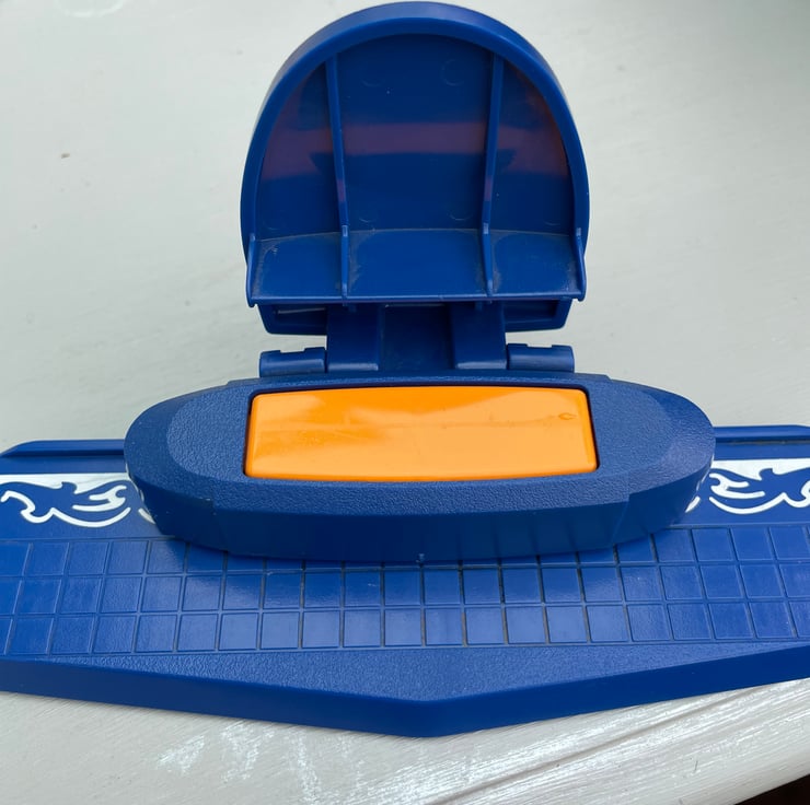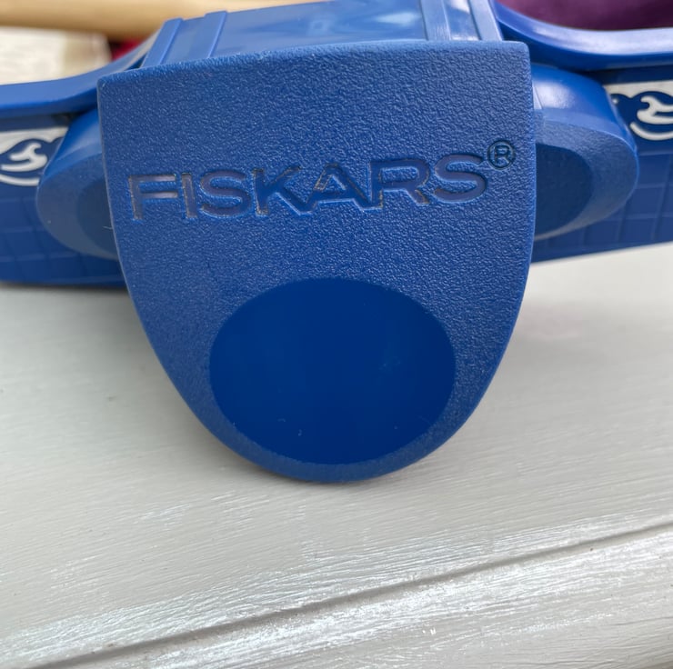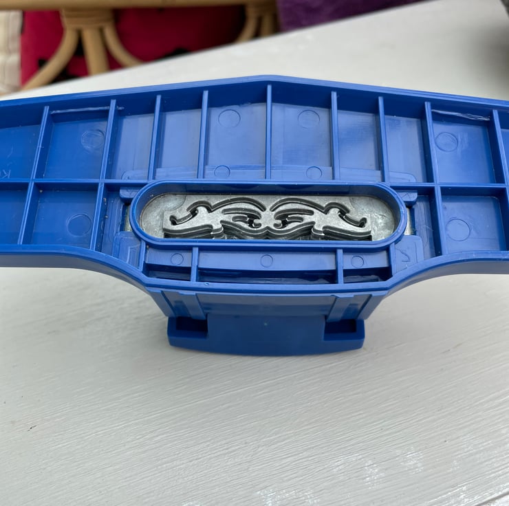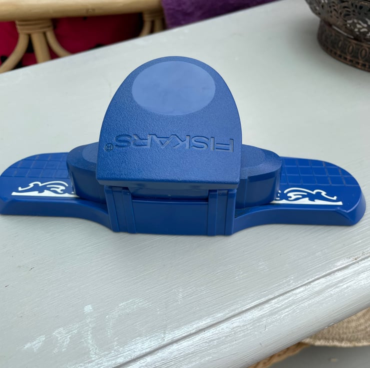 A Fiskars paper punch with a repeatable pattern, the base has the design printed on it to line up the repeat. The design is an elegant swirl to edge any size piece of paper.