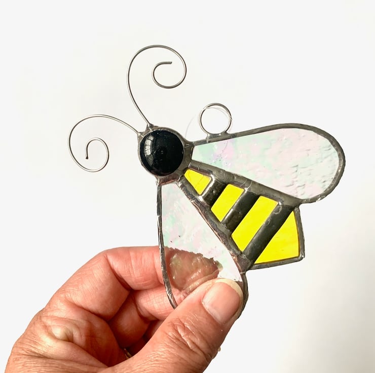 I have four of these bees for sale and the glass used for each is slightly different. A yellow glass has been used for the body with clear textured glass for the wings.