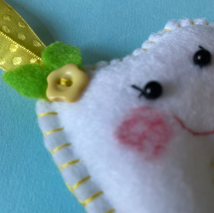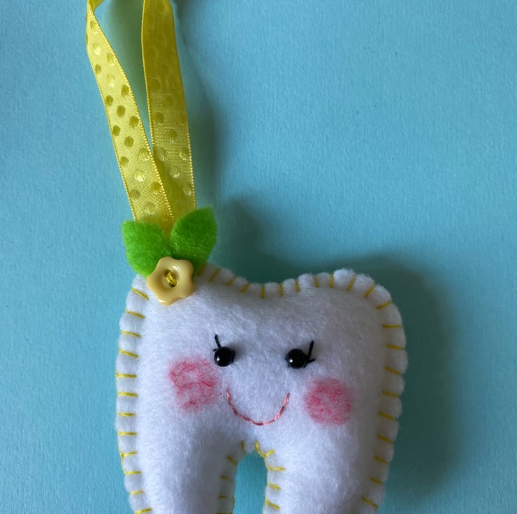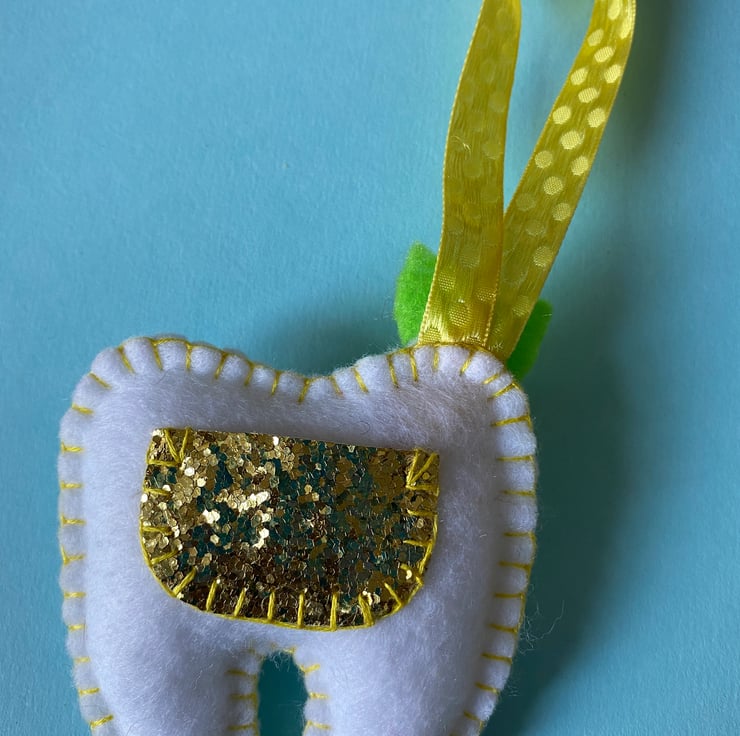 Made of White Felt with Yellow Thread, Ribbon and Flower Button… I’ve added a Gold Glitter Pocket on the back for the teeth and any pennies left in return…
