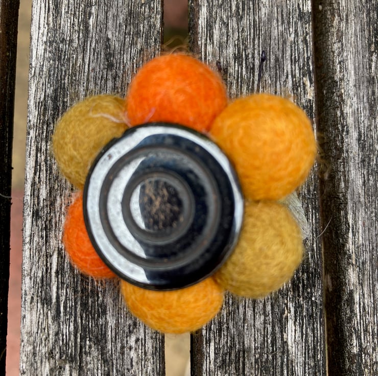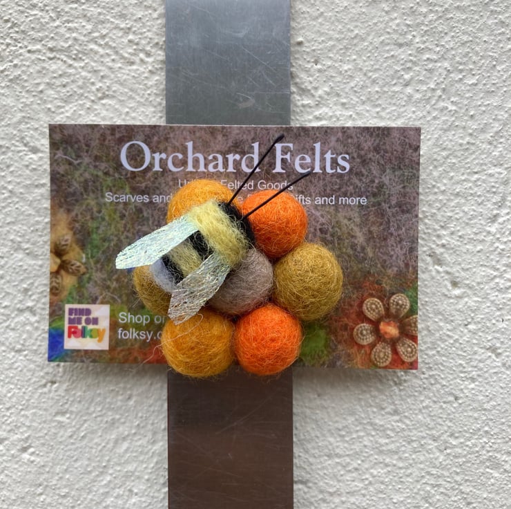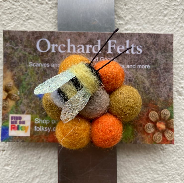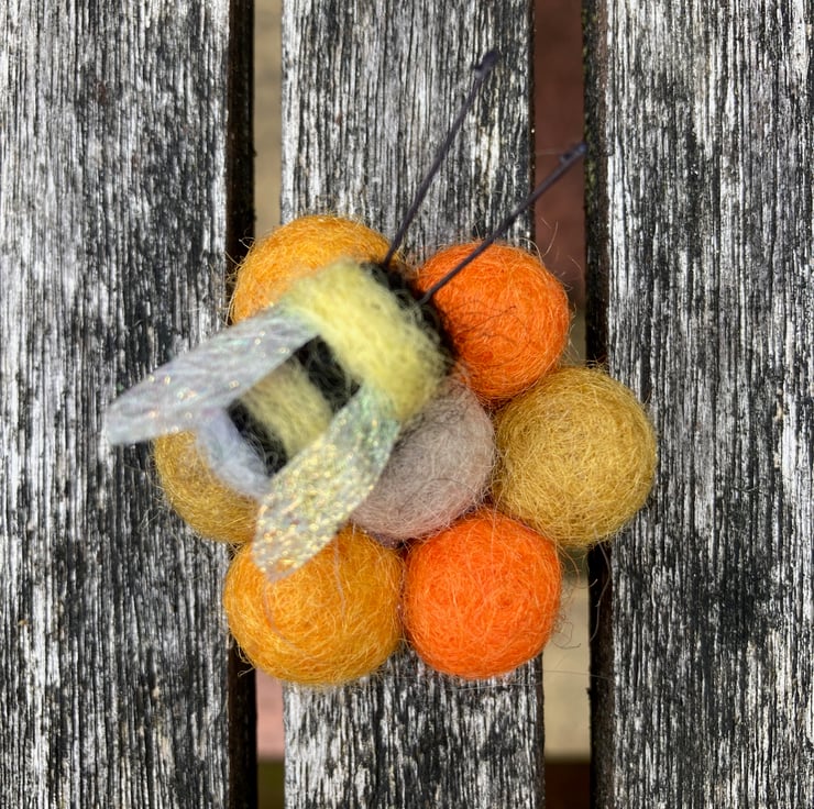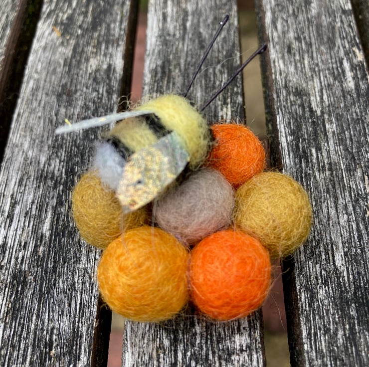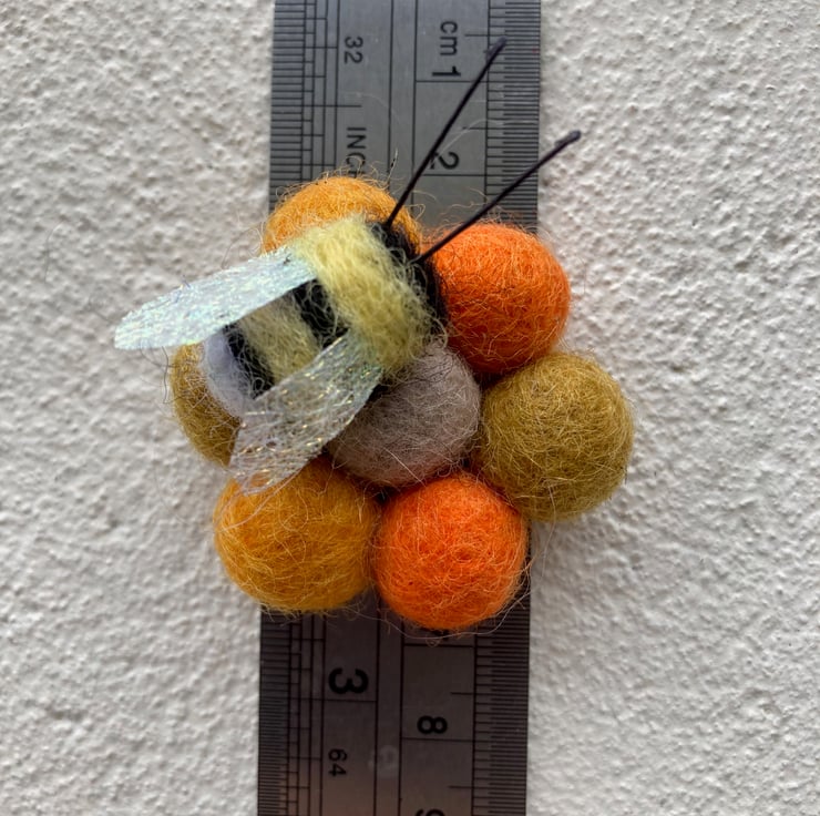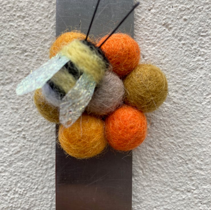 A bumble bee needle felted from woollen fibres has been mounted on a yellow and orange felt ball flower to create this fridge magnet. The felt ball flower has been made using small (1.5cm) felt balls. The needle felted bee has wire antennae and iridescent, shimmering Angelina wings. On the reverse of the flower, a 2.5cm magnet has been added. The flower measures approximately 4.5cm in diameter.