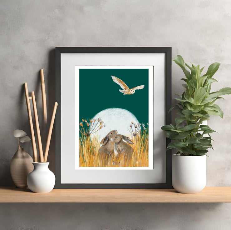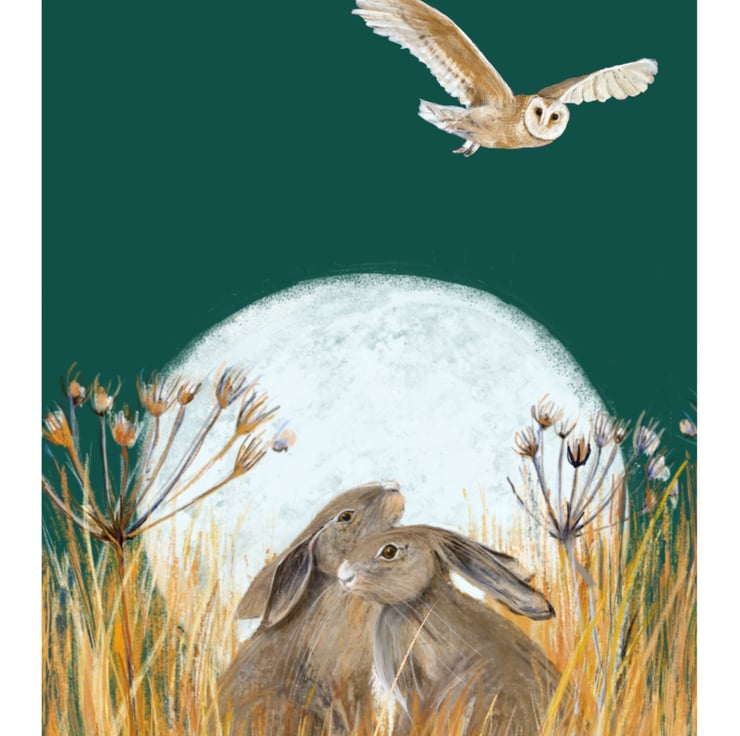 These two hares in moonlight are a favourite with my customers with a lovely the deep jade background which highlights the flying barn owl. It would make a great gift or addition to your own home.
