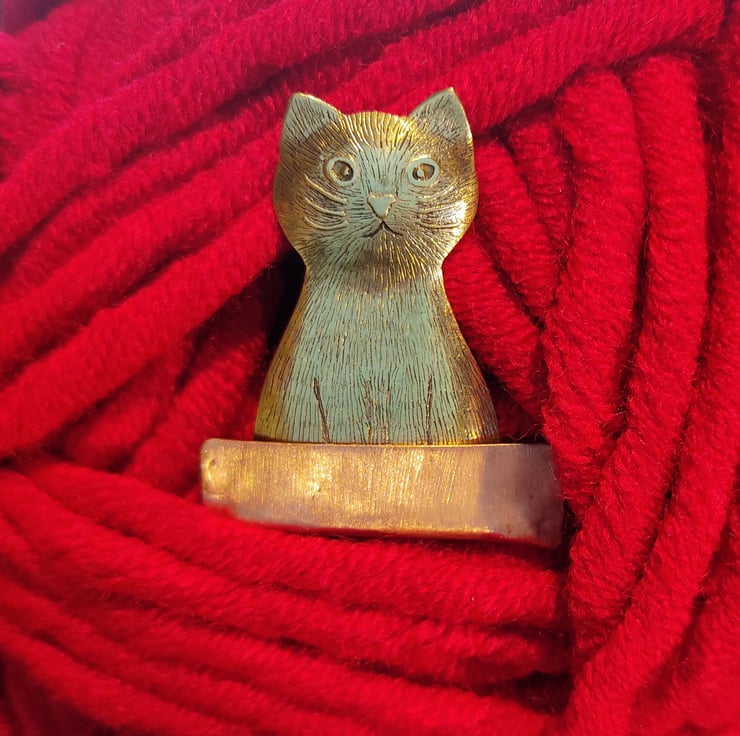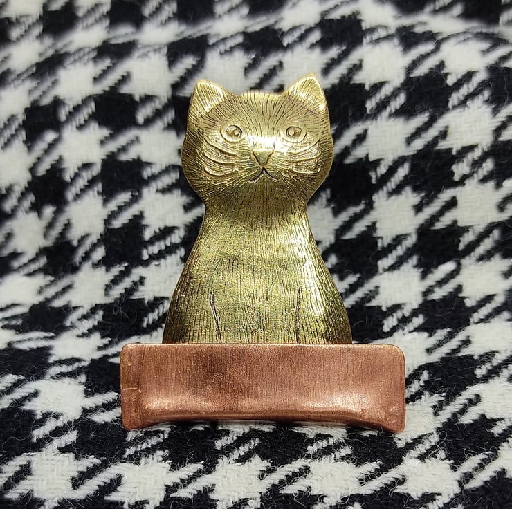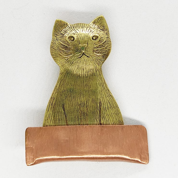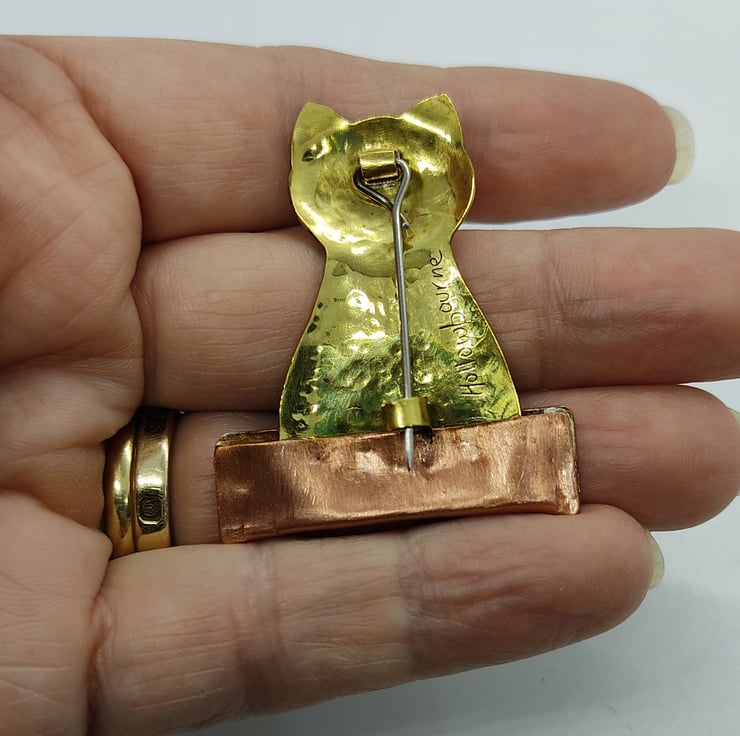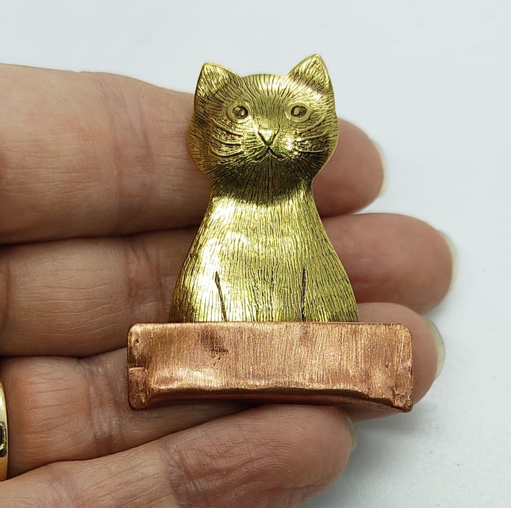 Etched brass cat , all hand drawn sitting in a copper box. The pin on the back is sprung stainless steel (of the type they make teeth braces from!).