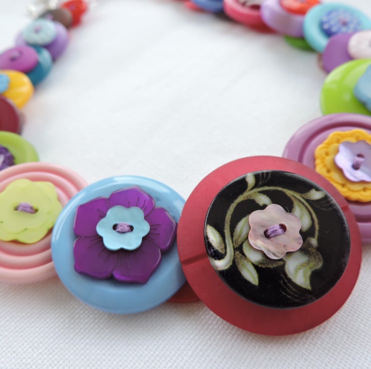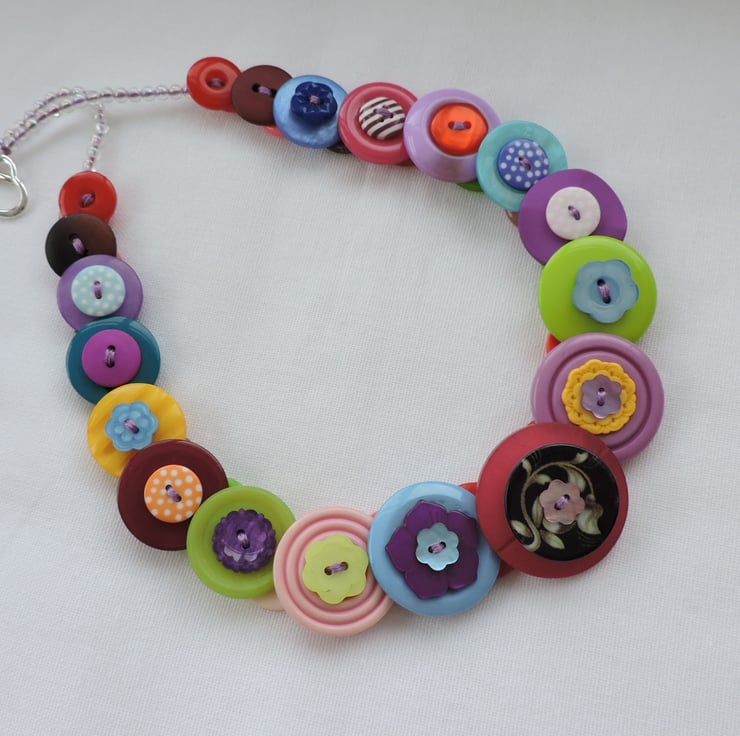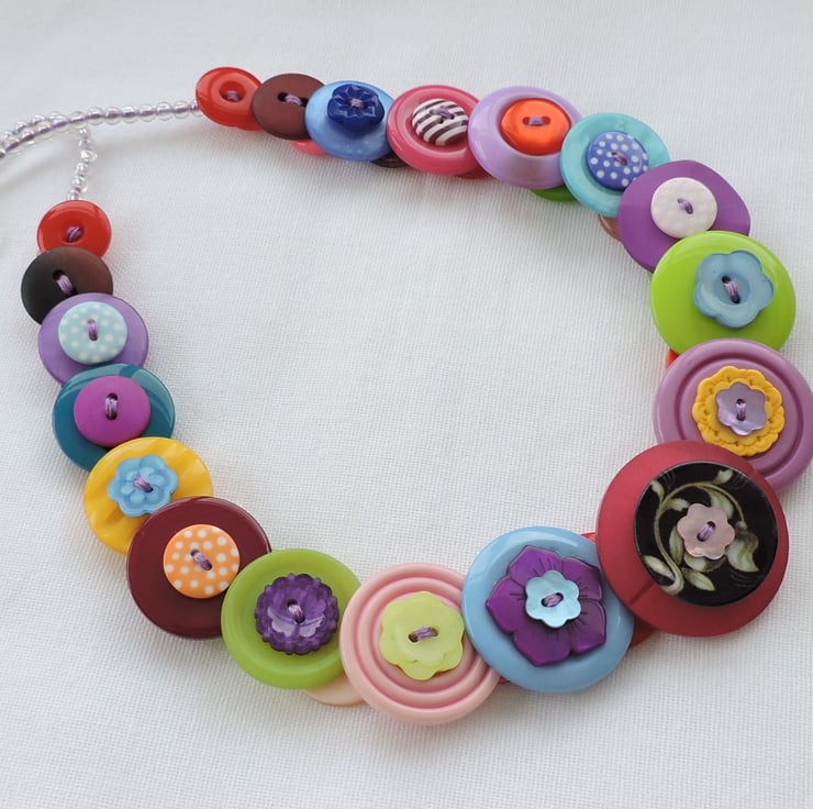 Sale was £10.00 now £7.00 I've made this striking button necklace using an assortment of different coloured buttons. Layered, stacked, threaded and knotted and finished with little Aurora Borealis beads which sit comfortably around the back of the neck and a silver plated toggle clasp.
