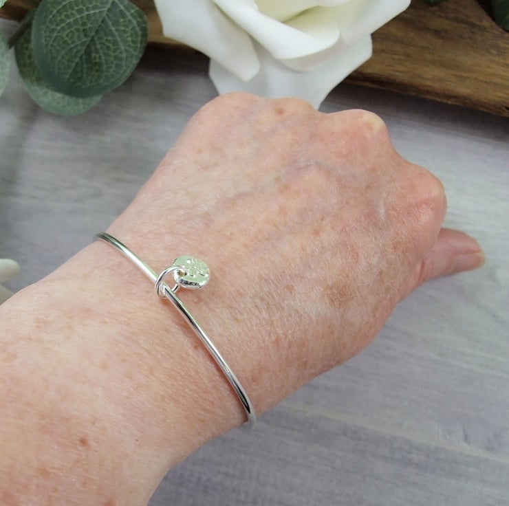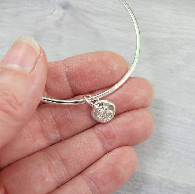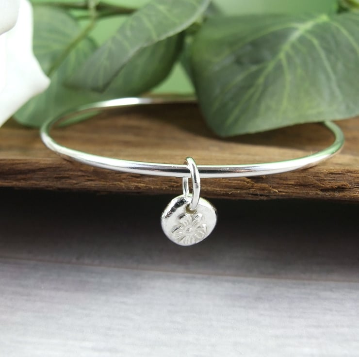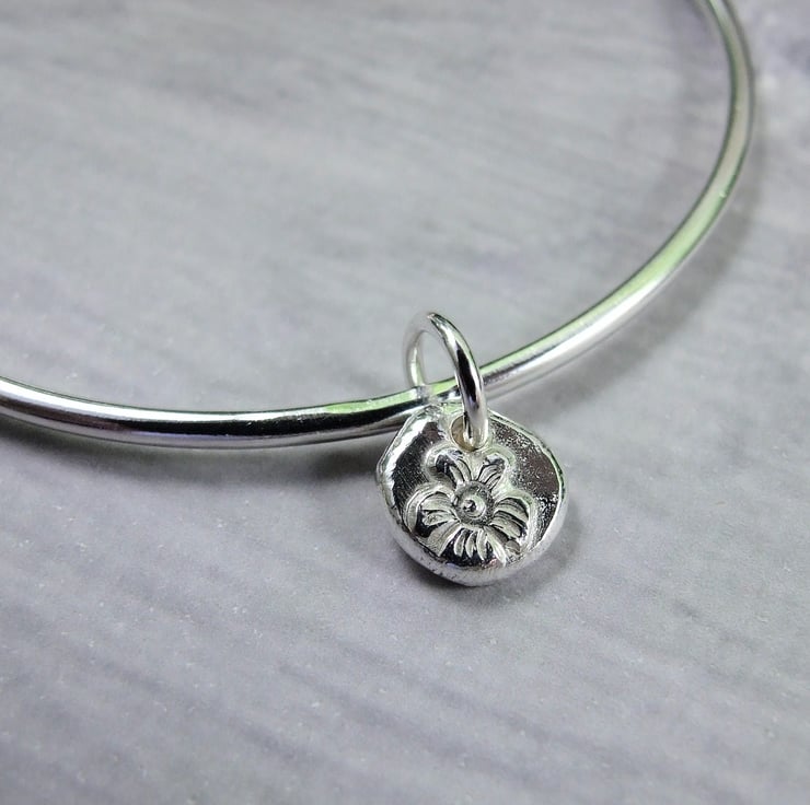 I have made the bangle from 2.5mm wide solid recycled sterling silver wire which I have soldered shaped into a bangle. The charm is made from recycled silver that I have heated to melting point and them hammered into a steel mould to create the flower impression. The charm has also been soldered onto the bangle .