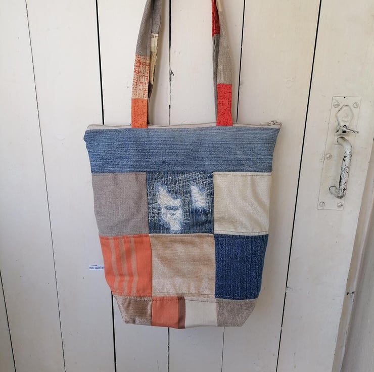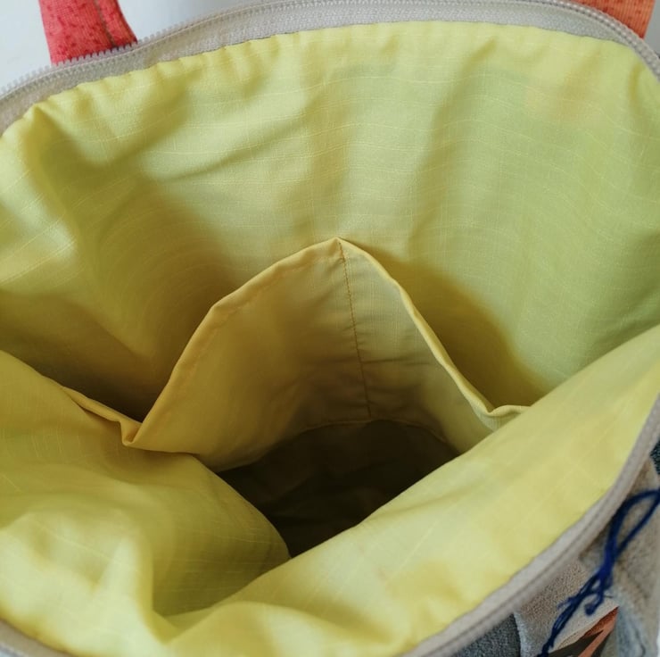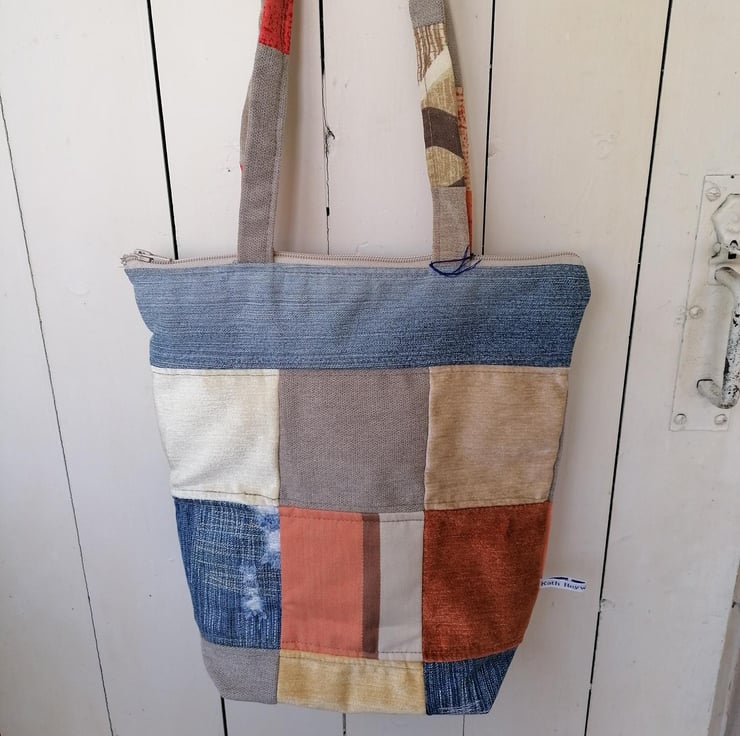A fabulous, soft structured bag. Handmade patchwork from gorgeous upholstery fabric samples and lined with a contrasting yellow fabric. The handles are made from patchwork and long enough to carry over the shoulder or in the hand.