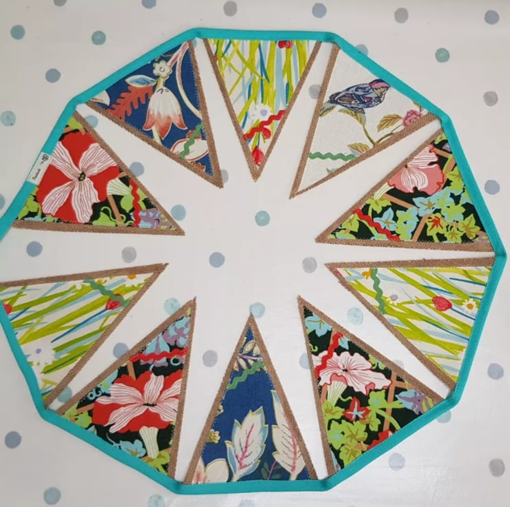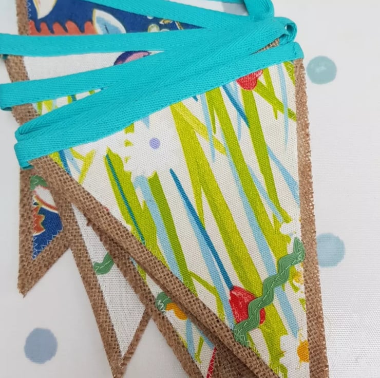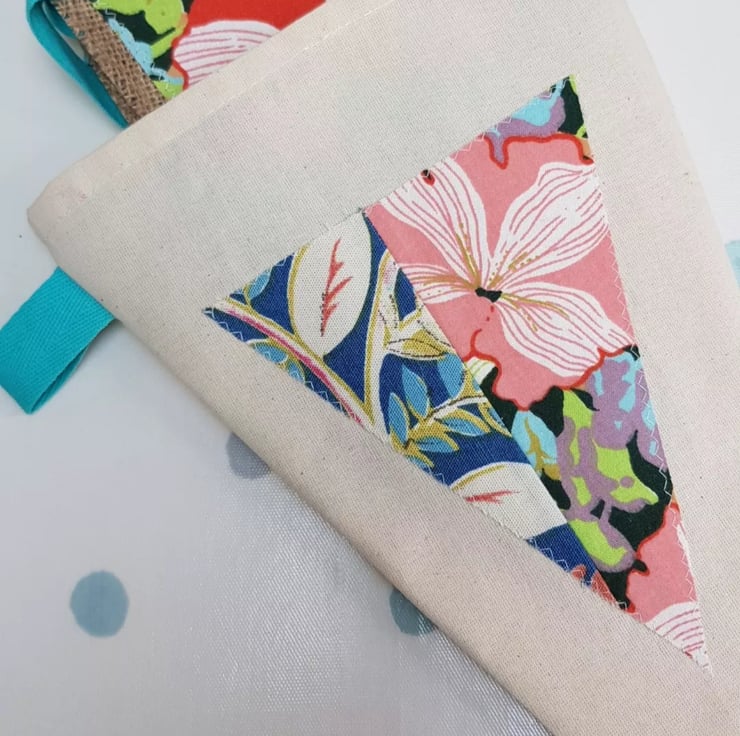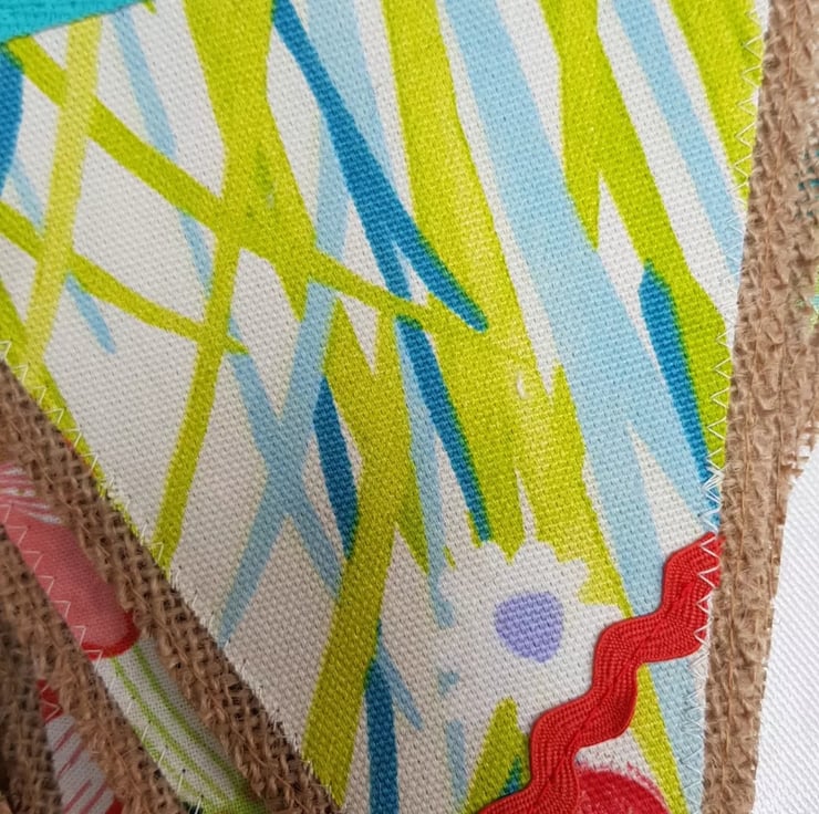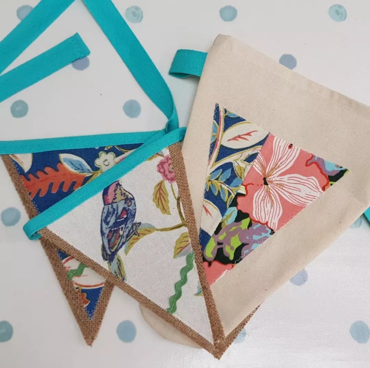 This pretty bunting has hessian penants onto which I have stitched good quality vintage furnishing fabric remnants. I have added ricrac for that vi stage look.Every penant is different so this is an unique item that would look great in a garden, conservatory, or summer house