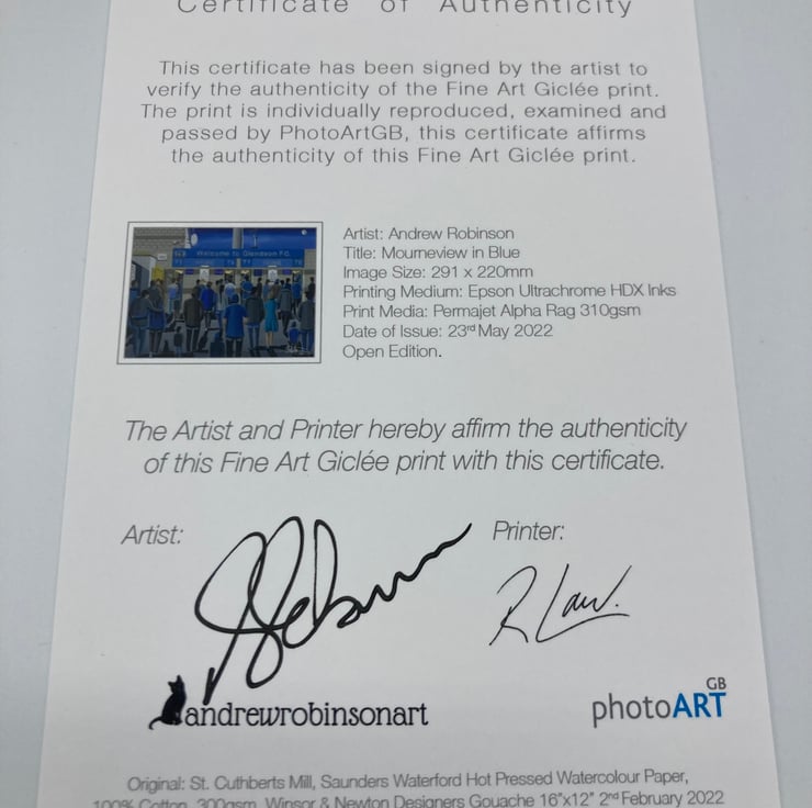 The framed print comes with a 'Certificate of Authenticity' which documents the details of the original painting and the art print. The Certificate of Authenticity is affirmed with a signature from both myself (the artist) and the printer.