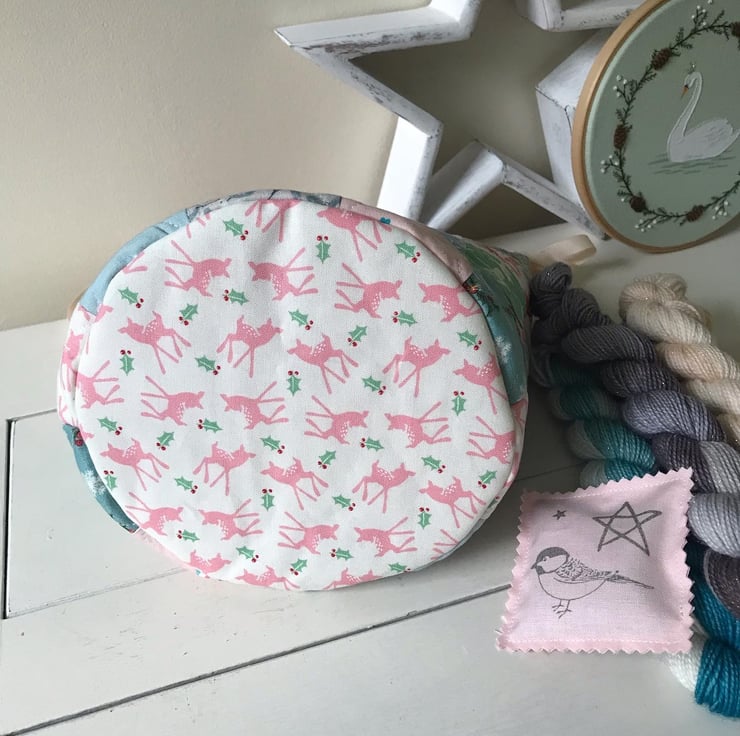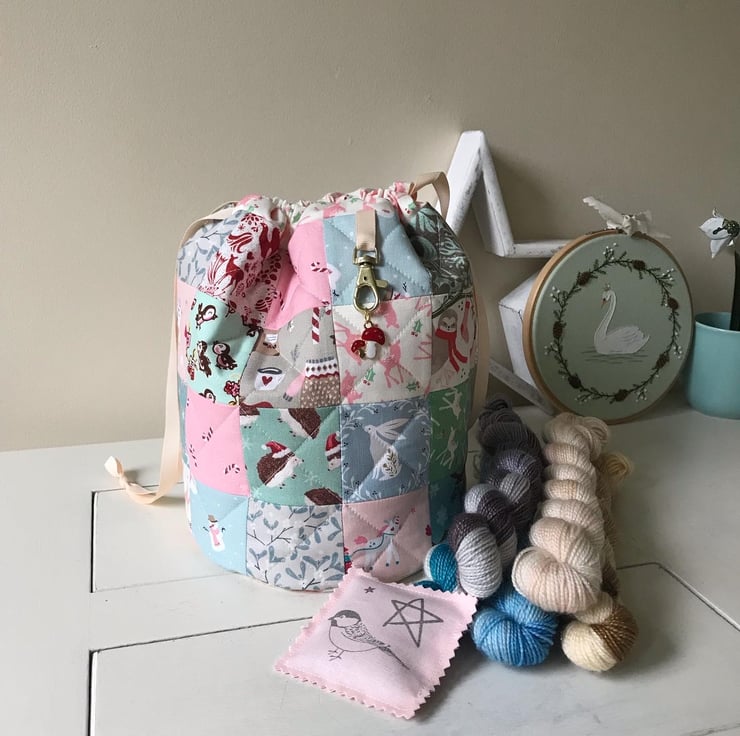 Hand crafted round based adorable little Draw string bag to keep your hand knitted socks or other small projects such as wrist warmers in.