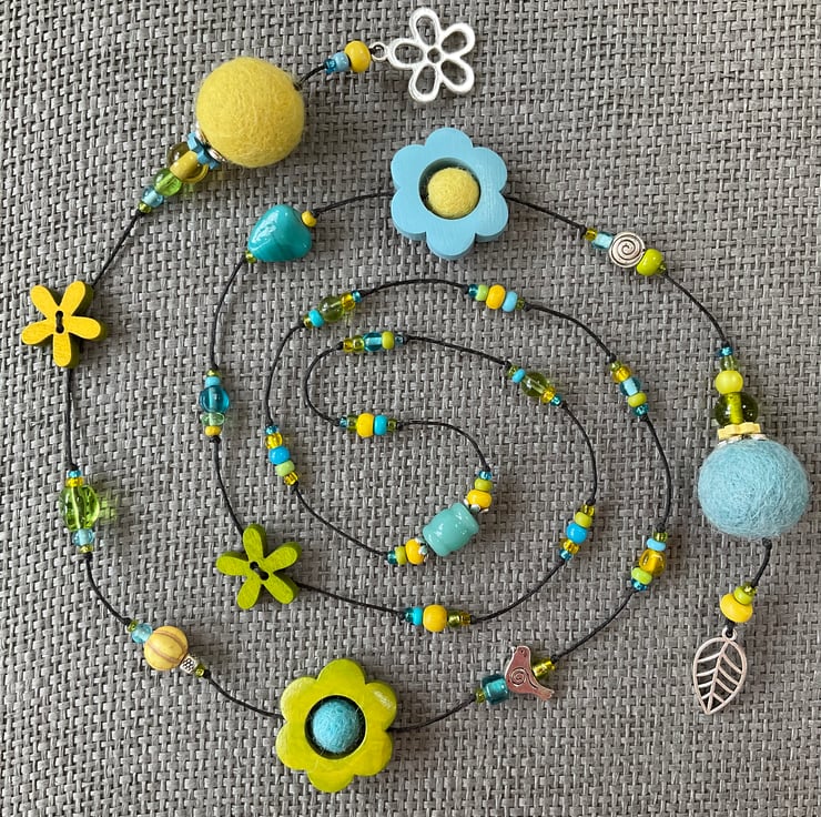 Lariat necklace featuring a glorious mixture of beads in shades of yellow, pale blue and green. The beads include large and small wood flowers, felt balls, glass, Polaris and wooden beads, as well as antique silver tone bird, spiral and flower beads. The necklace is finished at the ends with antique silver tone flower and leaf charms and is strung on strong, flexible waxed linen thread.