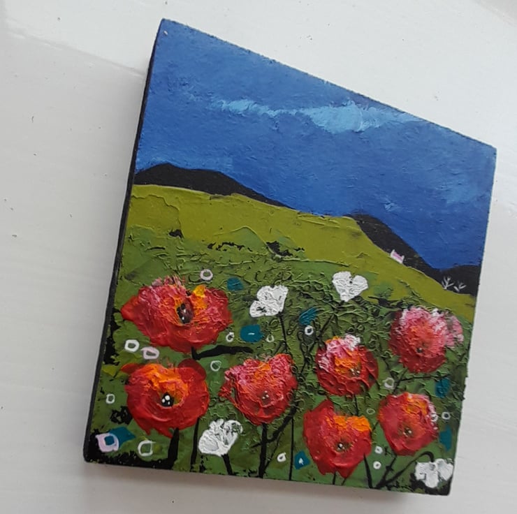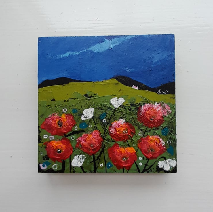 This 10 x 10 cm painting is varnished signed on the back and has a hook ready to hang. Great to brighten up a small corner or to give as a gift.