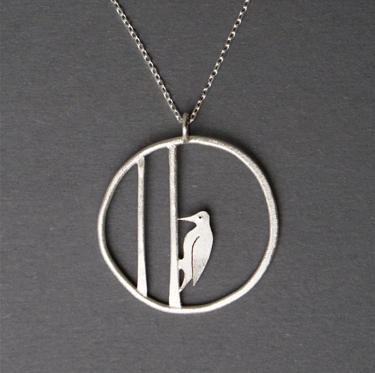 Fab necklace featuring two trees and a woodpecker set within a hand forged irregular circle for an organic feel, and hung from an 18 inch sterling silver chain. The finish is a lovely frosted texture which has a subtle sparkle and is slightly rough to the touch.