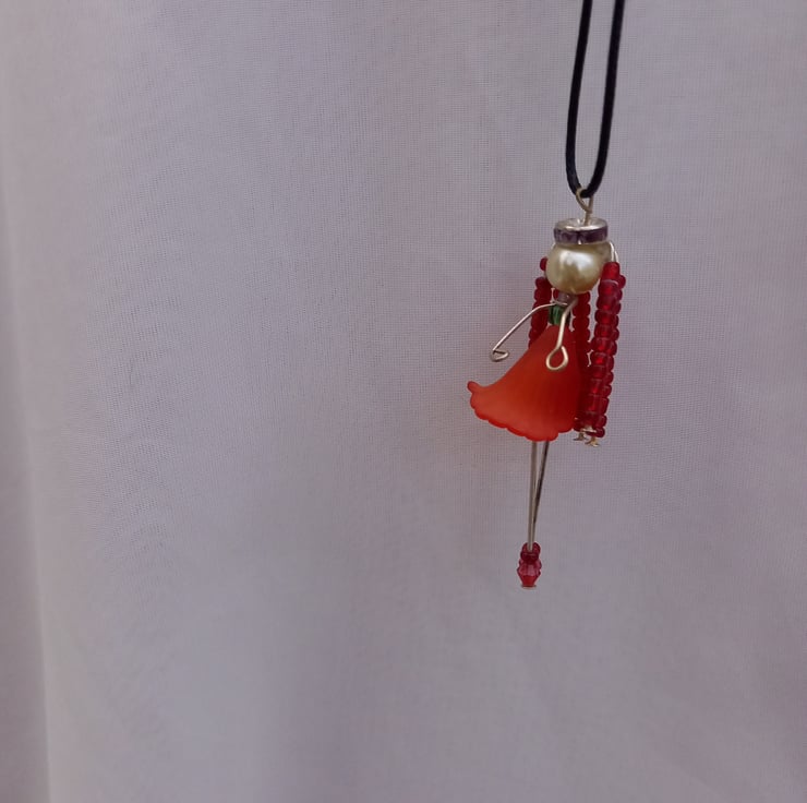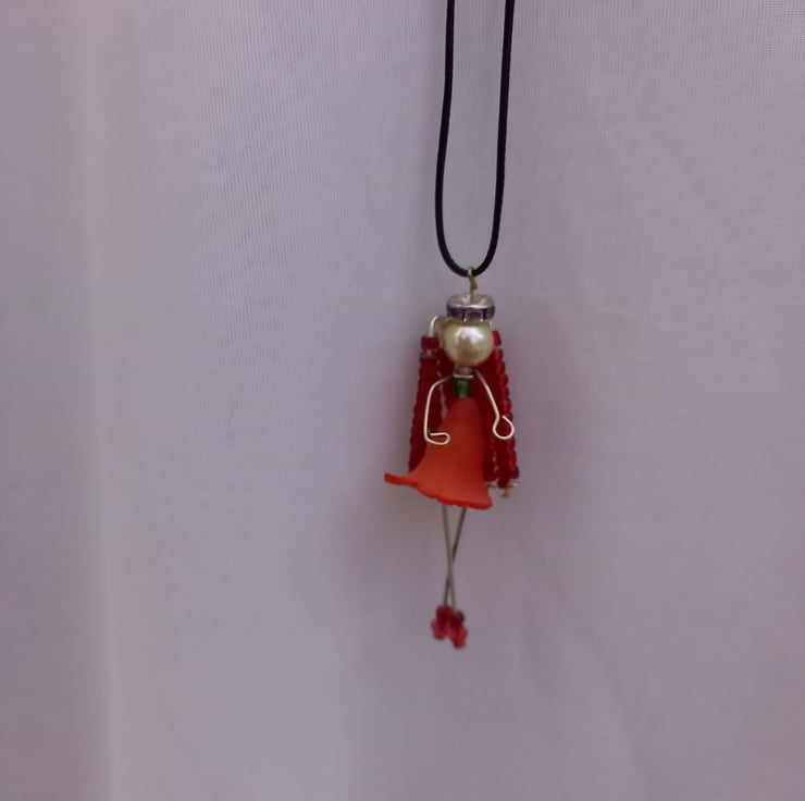 I used wire and glass beads to make this little lady she has an acrylic skirt on and is hanging by a cord