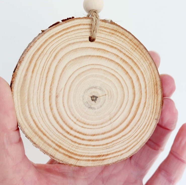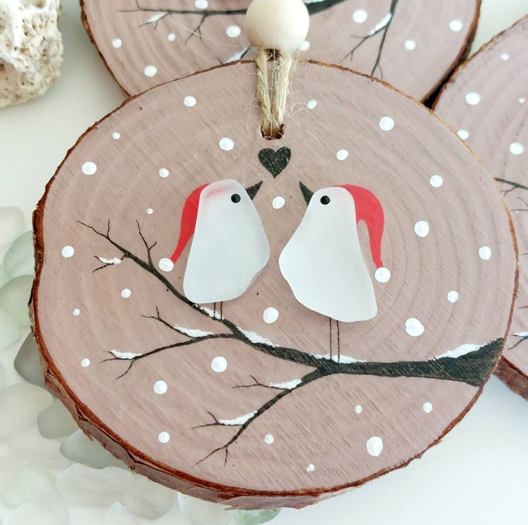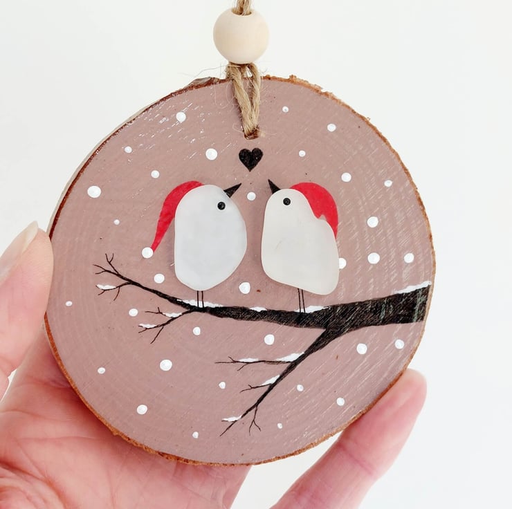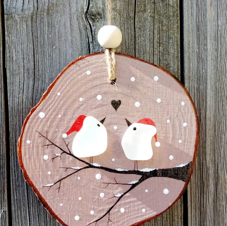 I have a few of these available and each one is individually crafted with a design featuring two birds perched on a hand drawn snowy branch. The background has been hand painted and the whole disc has been sealed with varnish to give it a glossy sheen. The ornament has been finished using natural jute twine and a wooden bead so it is ready to hang on your tree.