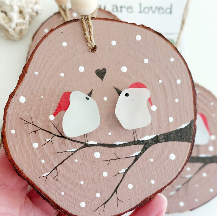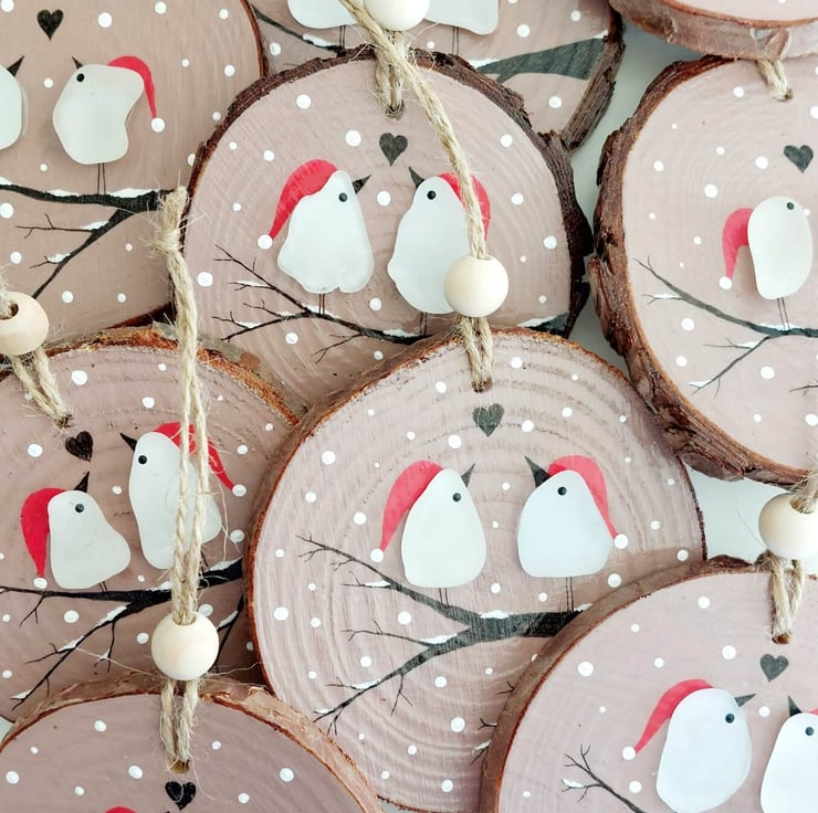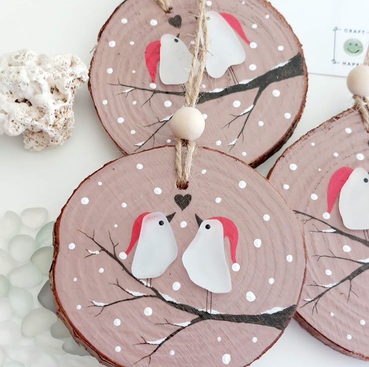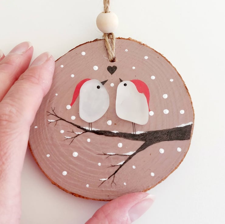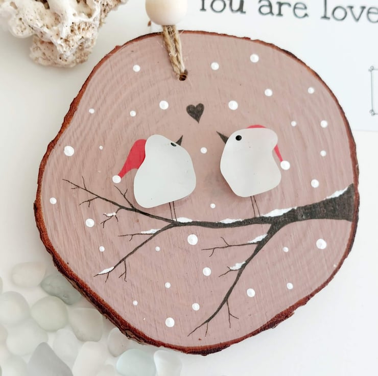Bring a coastal vibe to your festive decor this Christmas with this Sea Glass Quirky Birds Ornament! Hand-painted in dusky pink on a natural wooden base, this fun-filled Christmas ornament is adorned with naturally tumbled sea glass accents, fashioned into a pair of lovebirds in santa hats. It's the perfect unique addition to your tree or Christmas themed decor this year.