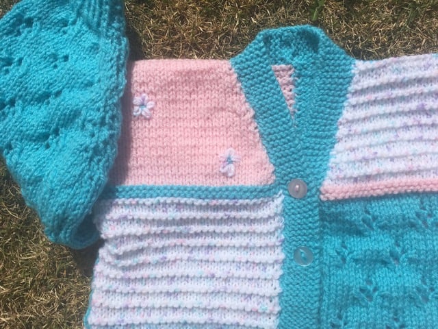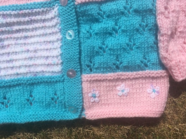 Super patchwork cardigan for a pretty little girl in a variety of stitches and colours. Knitted in torquoise/pink and marl DK and in a variety of knitting stitches, this cardigan will fit 6 - 12 months, fastens with 4 matching buttons and is finished with embroidered flowers.