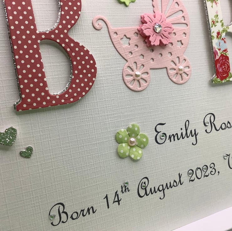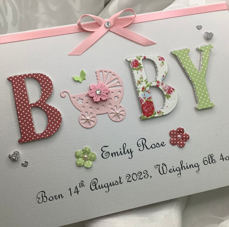 This handmade personalised new baby girl card is A5 in size ( 210mm x 150mm) and is on 300gsm heavyweight linen cardstock. The card can be personalised with the name, date of birth and birth weight.