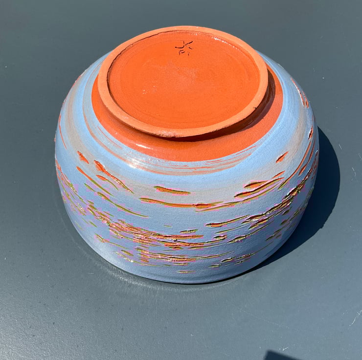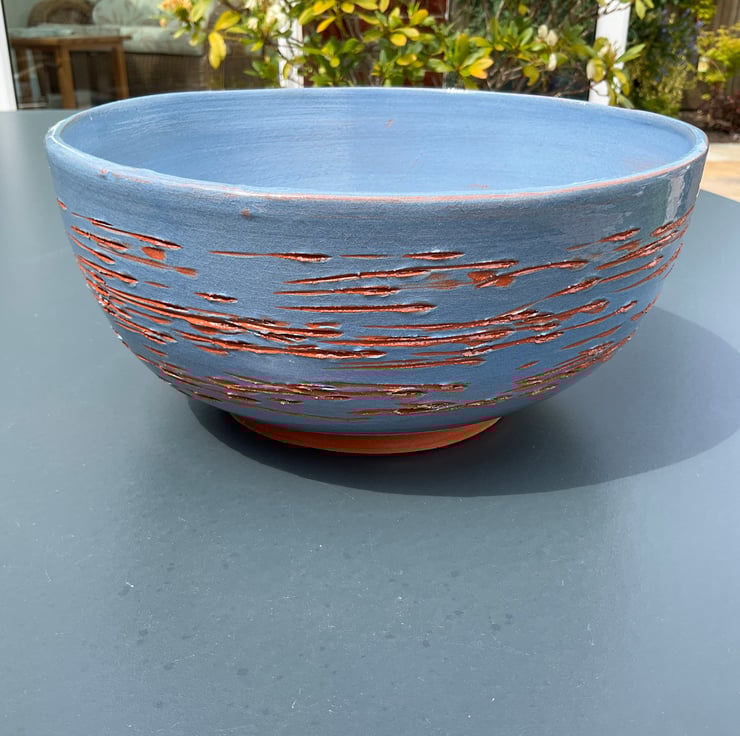 A lovely salad bowl and servers set comprising a wheel thrown terracotta bowl and a pair of beech wood salad servers ideal for alfresco dining. The terracotta bowl has been decorated in a light blue underglaze, the external surface has then been cut through exposing the terracotta clay body before overcoating coating in a satin glaze.