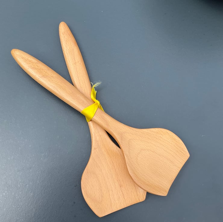 The bowl is complemented by a pair of hand carved serving utensils made out of hard beech wood finished with multiple coats of food safe oil providing a deep satin finish. The servers are gently tapered toward the heads and are nicely balanced to sit comfortable in the hand. All the edges are rounded, the surfaces sanded to a very smooth, tactile finish.