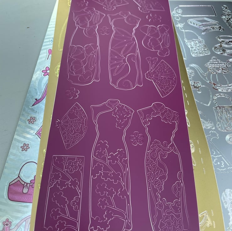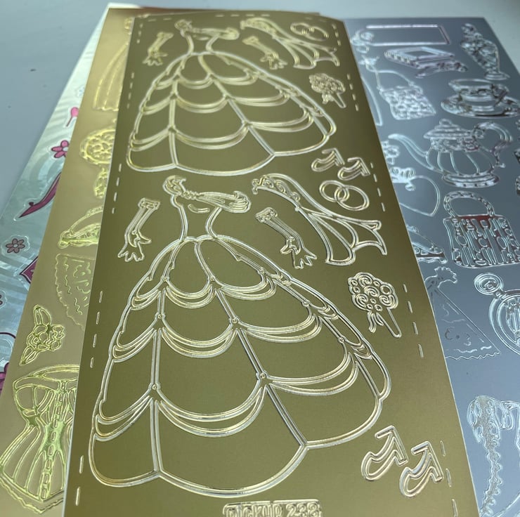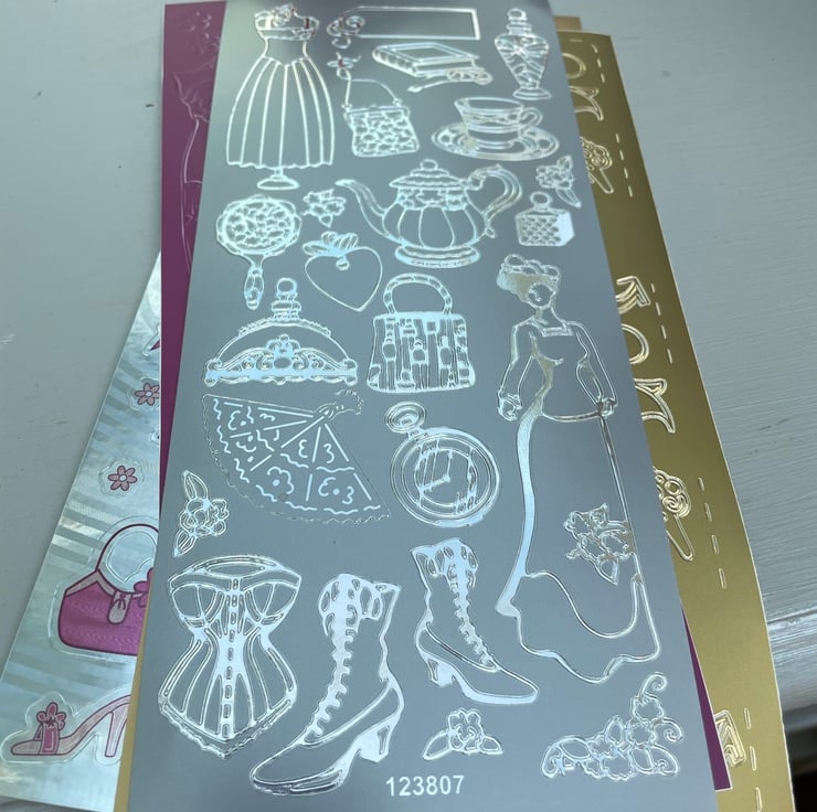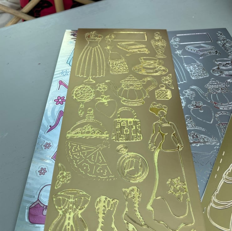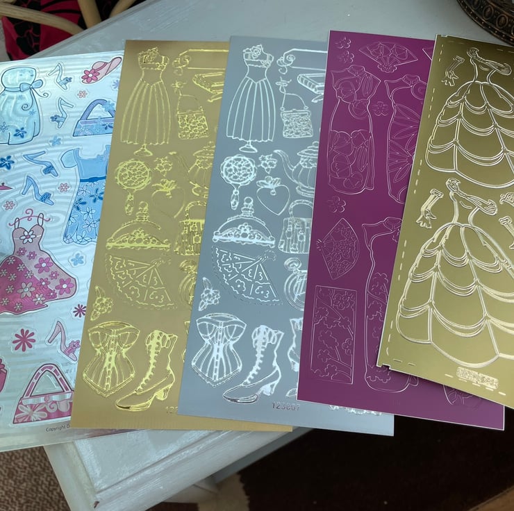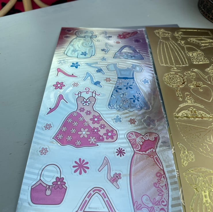 A selection of 5 sheets of peel off stickers. This set contains 1 silver and 1 gold sheet of victorian inspired designs, 1 pink sheet of Japanese dresses, 1 sheet os silver and coloured dresses, shoes and handbags, 1 gold sheet of beauty and the beast style dresses. Each sheet has many designs and additional stickers. For all your crafting needs.