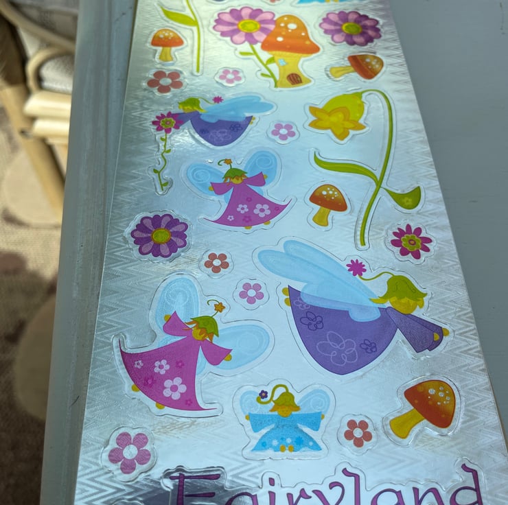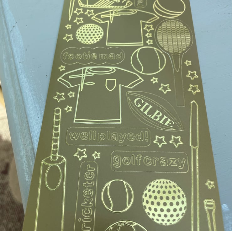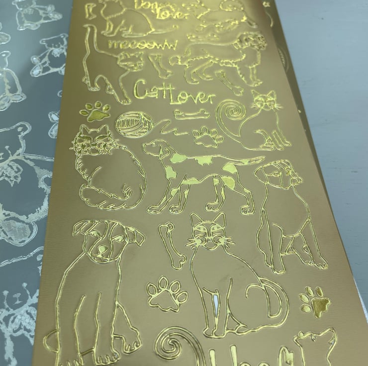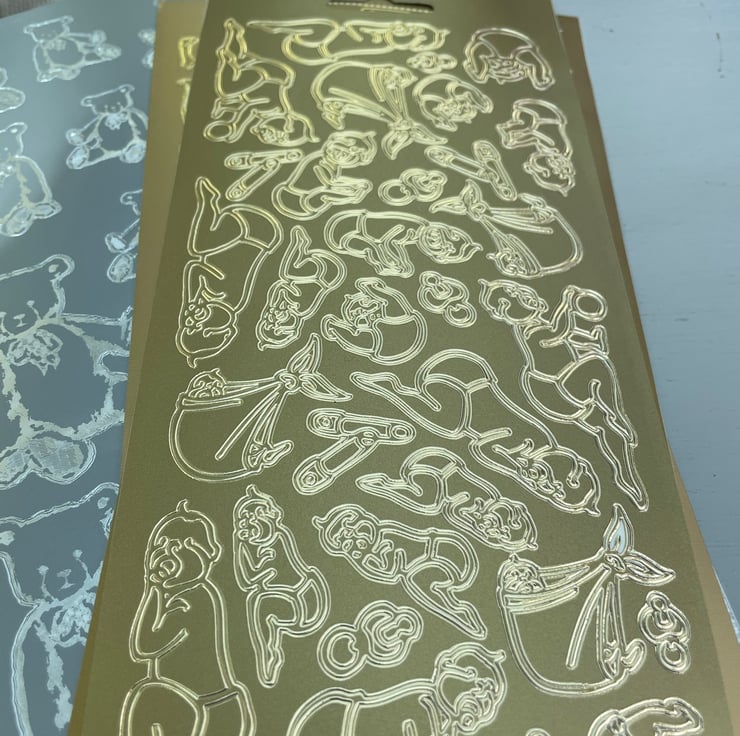 A set of 7 sheets of peel off stickers. They consist of 1 gold sheet of baby outline designs, a gold cross/religious designs, a gold cat and dog sheet, a silver teddy bear sheet, a gold sports themed sheet, a gold fairy themed sheet and a matching silver and colured sheet. All good for paper crafting.