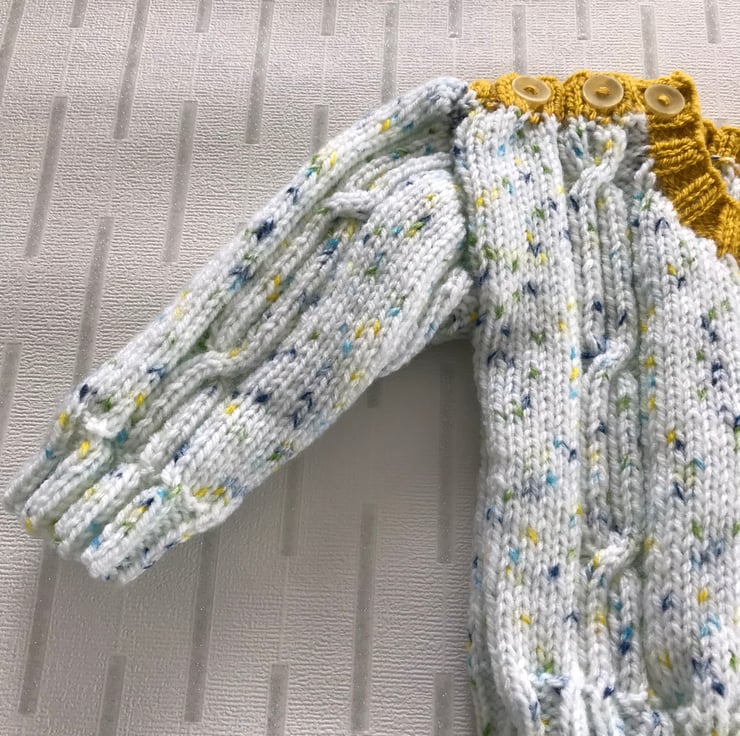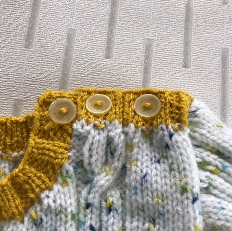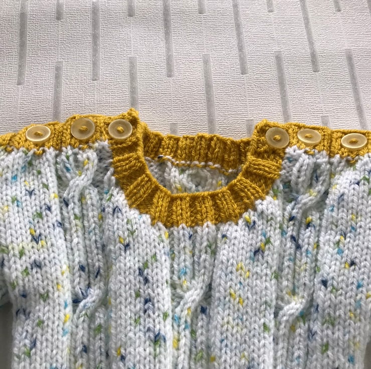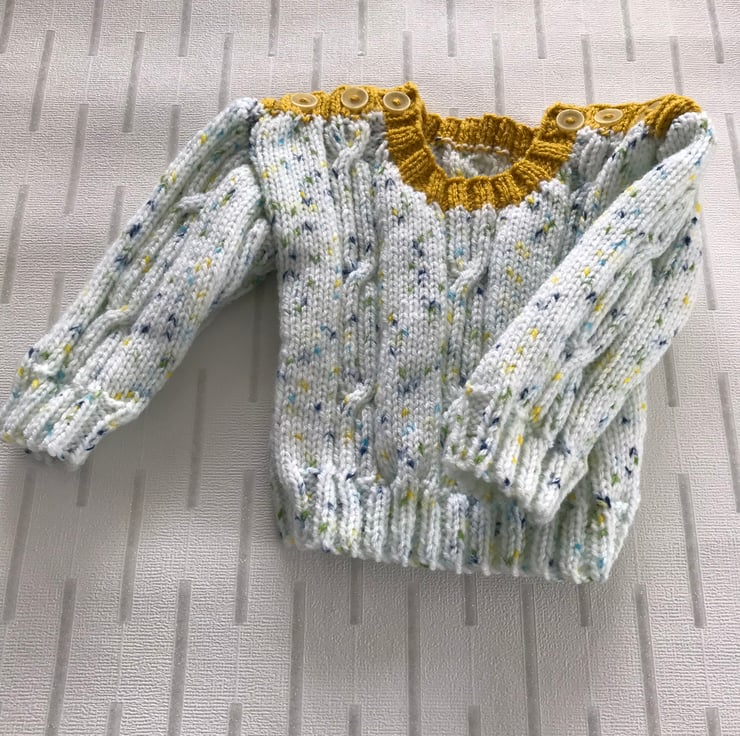 A hand knitted jumper worked in a speckled acrylic yarn. The jumper has plain and cabled panels on the front, back and sleeves. It has a contrasting yarn used for the neck and shoulder bands. It fastens on both shoulders with three buttons.