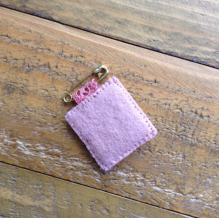 I have embellished a square piece of felt with Liberty fabric, vintage lace and a cute cat in teacup charm (secured with invisible thread). The felt backing is sewn on with tiny blanket stitch. The safety pin is attached with crochet lace. Has an inner stiffening to make it keep its shape. Measures 1.25 inches square - not including lace loop and pin.