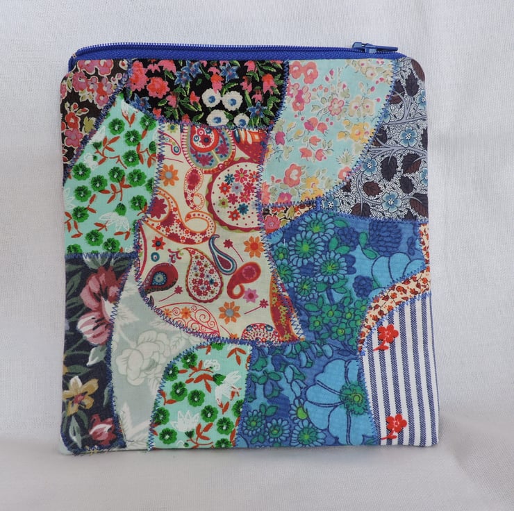 I've made this colourful make up bag, cosmetic bag with assorted cotton fabrics. Scrappy oddments of fabric in a variety of shapes, designs and colours have been appliqued to backing fabric for the outer fabric of the bag. A pretty pale grey blue fabric with white floral sprays has been used for the inner. It has interfacing to give stability to the bag, and is finished with a royal blue top zip.