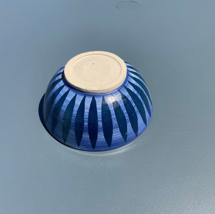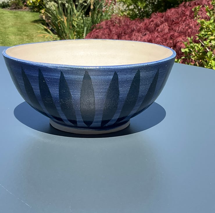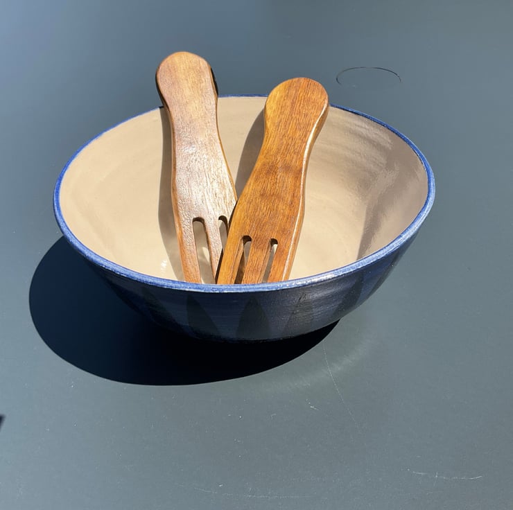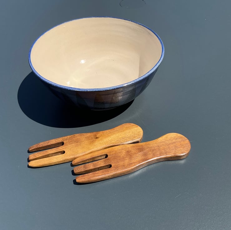 A lovely salad bowl and servers set comprising a wheel thrown stoneware serving bowl and a pair of handcarved wooden servers. The dish is decorated on the outside in a attractive blue pattern, the inside being plain white to highlight the colouration of the contents. The bowl dimensions are 220mm diameter x 90mm tall. The base of this dish is inscribed with my makers mark.