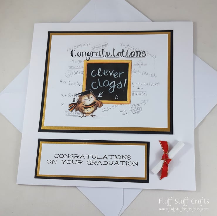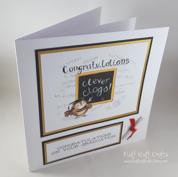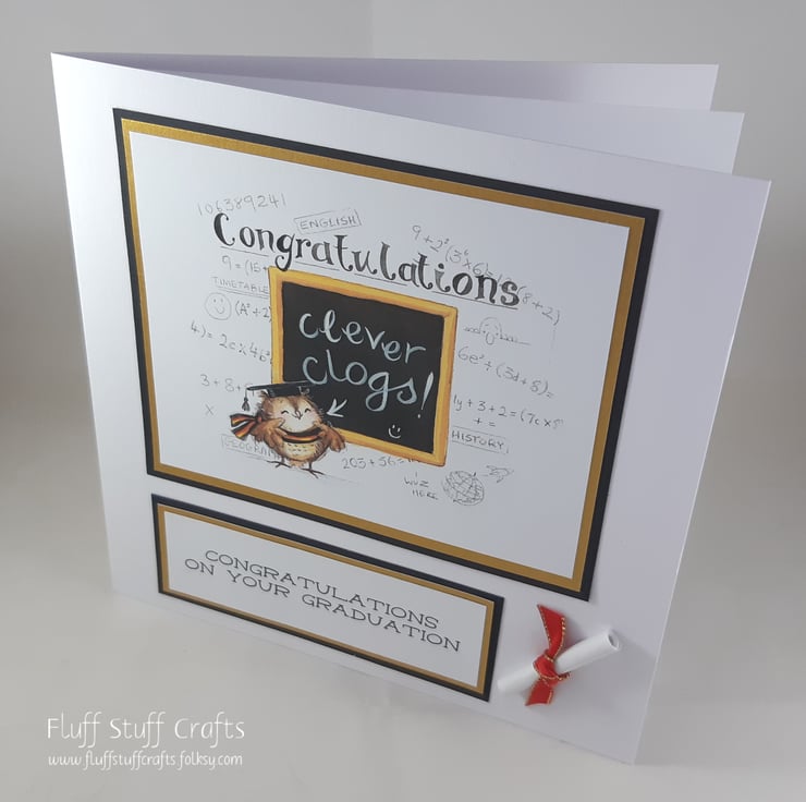 Square graduation card featuring an image of an owl in front of a black board with the message 'clever clogs'. The background of the image features calculations and formulae and the word Congratulations. The image is layered on black and gold card, along with the sentiment 'Congratulations on your graduation'. The card is also embellished with a paper scroll tied with red and gold ribbon. The insert has been left blank for your own message.