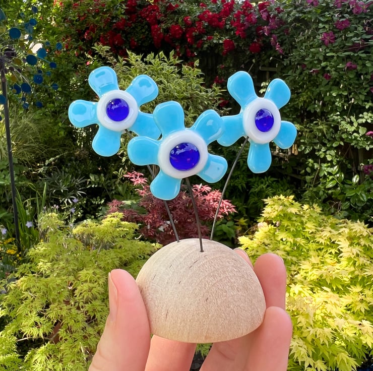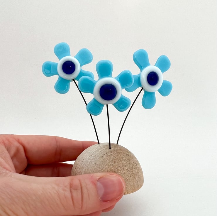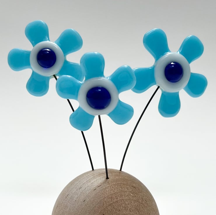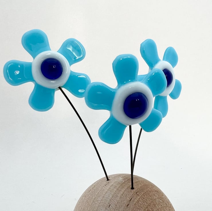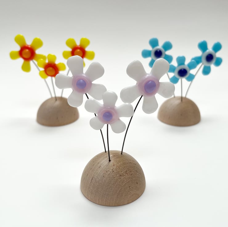 Fused glass freestanding piece on a solid wood base. This dinky sculpture combines turquoise, white and cobalt fused glass flowers, a solid wood base and wire stems. This looks lovely either on a window sill or on a mantelpiece. Each sculpture is completely unique.